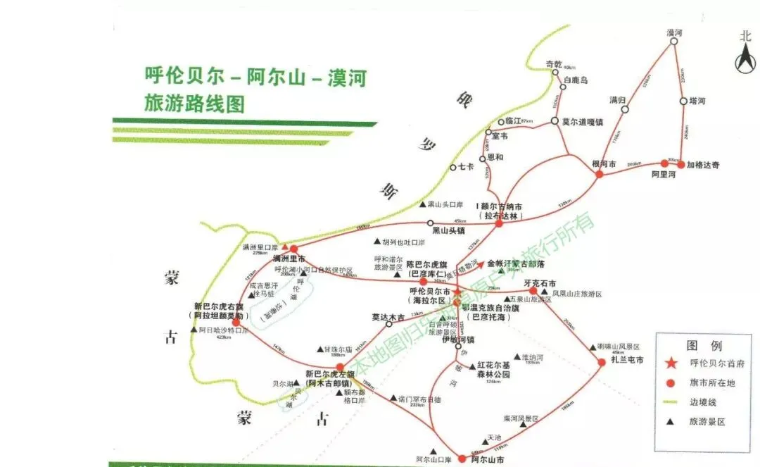 南北环线基础线路标注如下,红线是所走线路,特点玩的更有深度更全面,缺点时间略长,来一次呼伦贝尔不容易,如果您时间允许,强力推荐