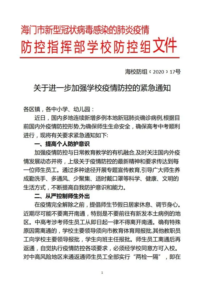 1.全市在启师生(家长)员工不得离通。确有特殊情况,学校领导向教育主管部门报批,教职员工向校长报批,学生向班主任报批,经批准后方可离通,绝不允许私自离通,更不得前往中高风险地区和境外。家长如外出(外地回启)必须如实向社区、学校报备,服从统一管理。