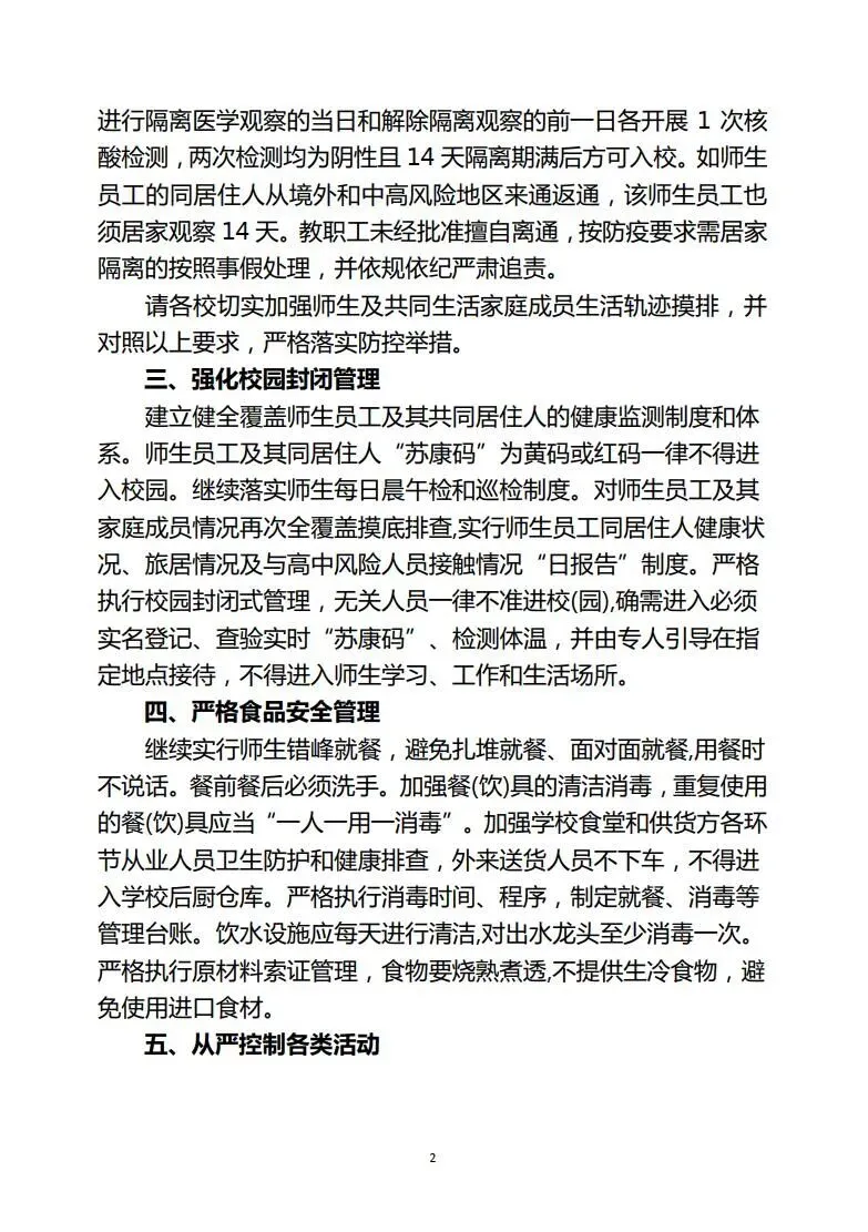 建立健全覆盖师生员工及其共同居住人的健康监测制度和体系。师生员工及其同居人“苏康码”为黄码或红码一律不得进入校园。继续落实师生每日晨午检和巡检制度,每日3点前上报缺课系统、省疫情防控系统。对师生员工及其家庭成员情况再次全覆盖摸底排查,实行师生员工同居住人健康状况、旅居情况及与高中风险人员解除情况“日报告”制度。严格执行校园封闭式管理,无关人员一律不准进校(园),确需进入必须实名登记、查验实时“苏康码”、检测体温,并由专人引导在指定地点接待,不得进入师生学习、工作和生活场所。