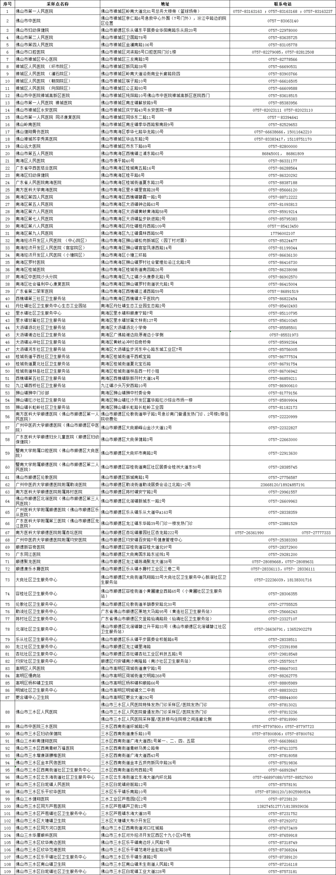来(返)佛山人员专门核酸采样点一览表