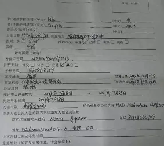 危秋洁的弟弟介绍说,本月18号,姐姐独自一人从福州出发,经由天津飞往日本北海道旅游。从危秋洁填写的签证申请表也可以看出,她在日本的行程,从7月18日至7月25日一共8天。