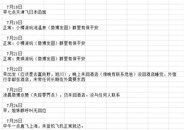 危秋洁家人及朋友整理的日程表(图中保平安应为报平安)