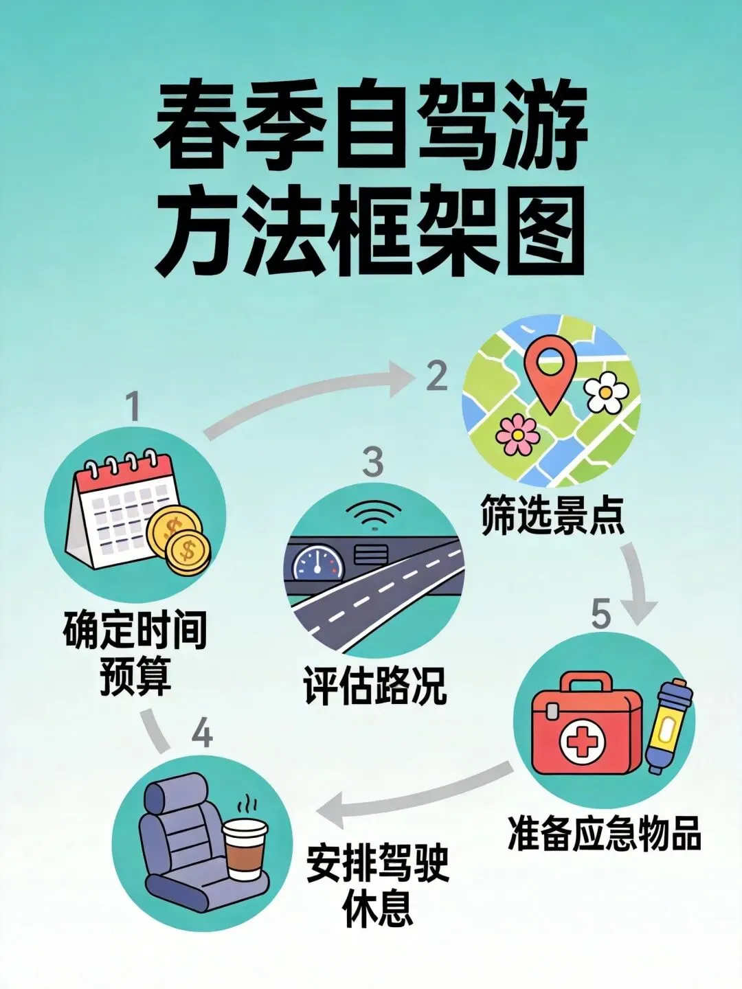 "春季自驾游的核心是在有限时间内最大化体验春季特色景观,合理规划路线是关键。" 问题定义:很多自驾爱好者在路线规划时存在三大误区:一是路线过长导致驾驶疲劳,二是景点选择杂乱无章缺乏主题,三是忽略春季季节性景观特色。正确的路线规划应该结合时间、兴趣点和路况信息,打造个性化的春季自驾行程。 方法框架 自驾行程设计方法: 1. 确定出行时间和预算; 2. 筛选春季特色景点和路线; 3. 评估路况和驾驶难度; 4. 合理安排每日驾驶时长和休息时间; 5. 准备必要的应急物品和车辆检查。春季自驾应重点关注赏花路线、气候特点和季节性景观,选择适合春季的自驾目的地。 "春季自驾行程设计应遵循"主题明确、节奏合理、安全第一"的原则,确保旅途既充实又轻松。"