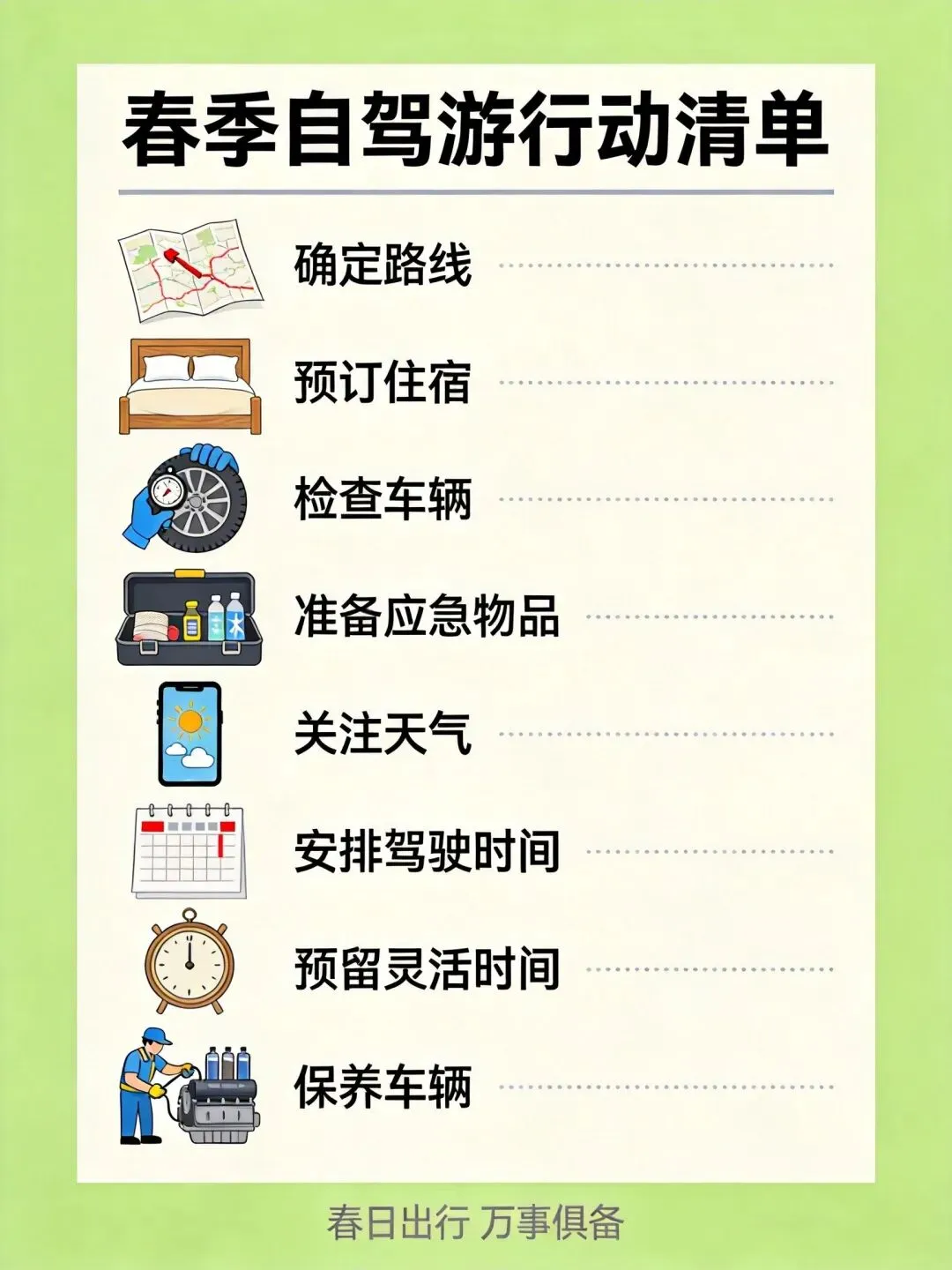 "春季自驾需提前了解目的地气候和路况,做好充分准备,才能避免陷入常见坑点,享受愉快旅途。" 适用边界:本文推荐的自驾路线适合拥有1-2周假期的自驾爱好者,适合家庭出游和朋友结伴出行。对于驾驶经验不足的新手,建议选择路况较好的高速路线,避免复杂山路。春季自驾最佳时间为3-4月,此时气温适宜,花卉盛开,是一年中最适合自驾的季节。 行动清单 一页纸行动清单: