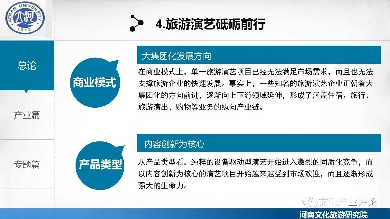 旅游演艺砥砺前行。随着10多年的大发展,旅游演艺已日渐成熟并开始进入调整期。数据显示,2016年全国旅游演出共计5.2万场,同比下降4.2%,票房收入34亿元,同比下降3.2%。同时,新一批大型旅游演艺项目开始落地,一些知名旅游演艺企业逐渐形成了涵盖住宿、旅行、旅游演出、旅游购物等业务的纵向产业链。