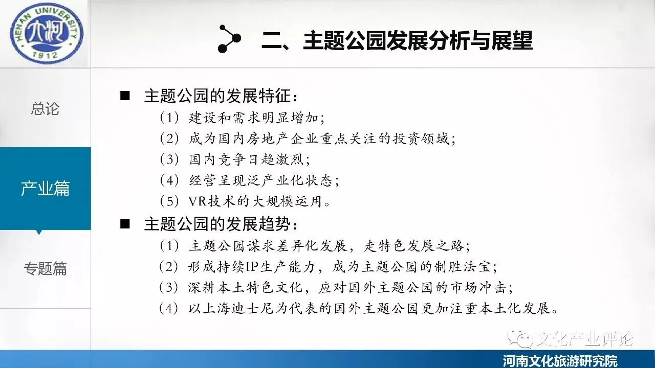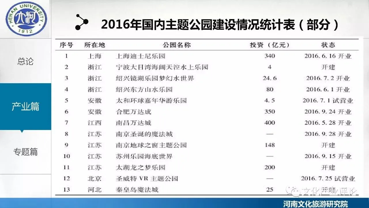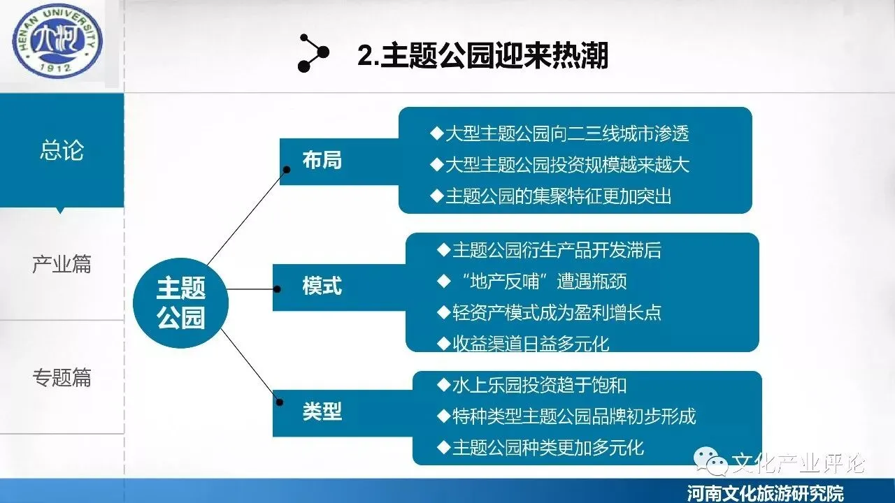 主题公园迎来热潮。从布局来看,大型主题公园的投资规模越来越大、集聚特征更加突出,而且已经开始向二三线城市渗透;从商业模式来看,主题公园衍生产品开发滞后,“地产反哺”模式面临严峻的考验。