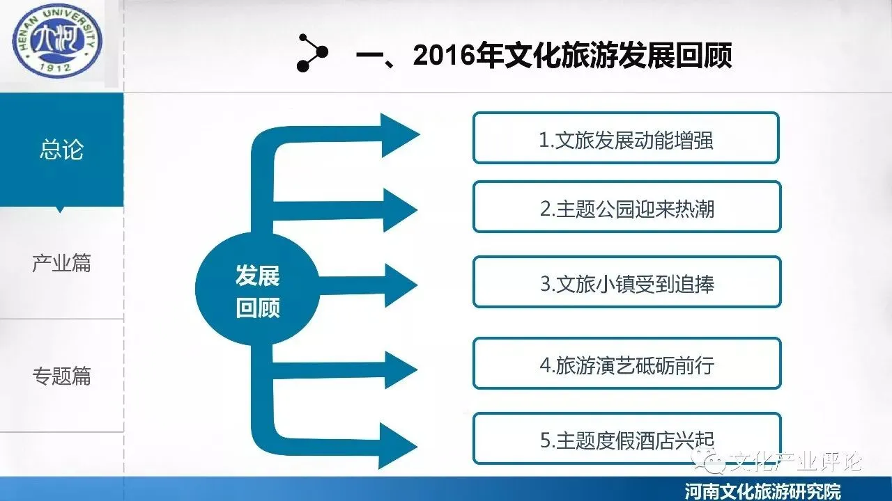 近日,国内第一个关于文化旅游的发展报告——《中国文化旅游发展报告2017》发布。该报告由河南文化旅游研究院的专家团队编写,回顾了2016年和2017年上半年的文化旅游发展状况,对旅游演艺、主题公园、主题酒店、文旅小镇、博物馆旅游、文化节庆等进行了详细分析,并对发展趋势进行了研判。