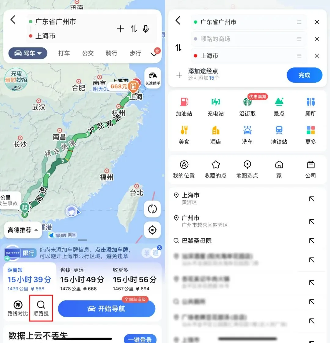 举例来说,从广州前往上海的路上,若你想顺路参观某个景点,只需在顺路搜中添加该景点,软件便会为你展示沿途的所有相关场所。