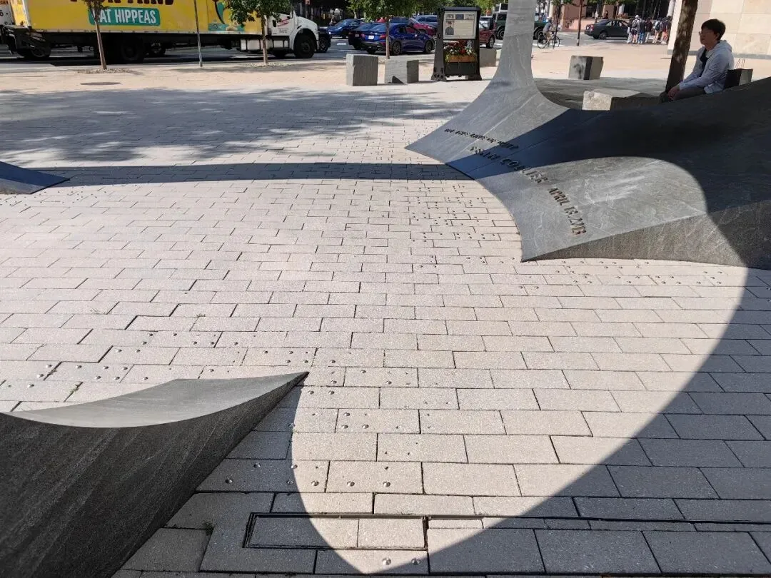 星形图案与中心空洞的交汇处形成了一个平滑、弯曲的表面,其下方用作斜面标记,并刻有“履行职责,肖恩·科利尔,2013年4月18日”。纪念亭最长的墙体保护着此处免受瓦萨街的影响,同时也形成了一个通往纪念区的入口。最突出的两堵墙与枪击发生的位置对齐,距离仅数英尺。面向南方的墙体上刻有肖恩兄弟悼词中的一句墓志铭:“愿你长命百岁,一如你所愿。”宽广的心胸、灿烂的笑容、周到的服务,无不洋溢着浓浓爱意成群的洋槐树为这座坚固的石构建筑上方构筑起一片生机盎然的树冠,用以标记时间的流逝。与之形成对比的是,镶嵌在铺路石上的点状灯光则永久性地铭刻下了2013年4月18日夜间天空中星群的轨迹。