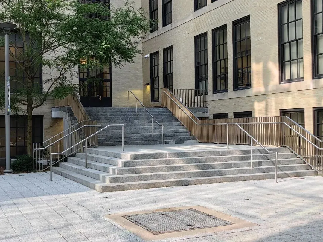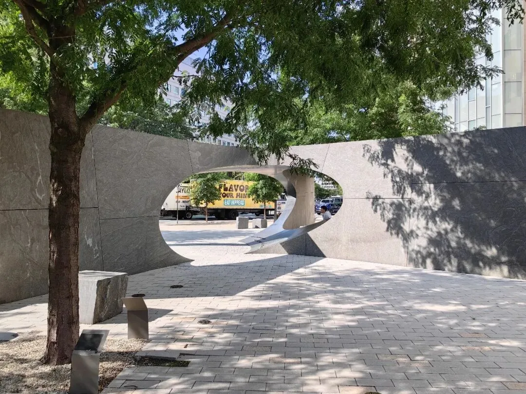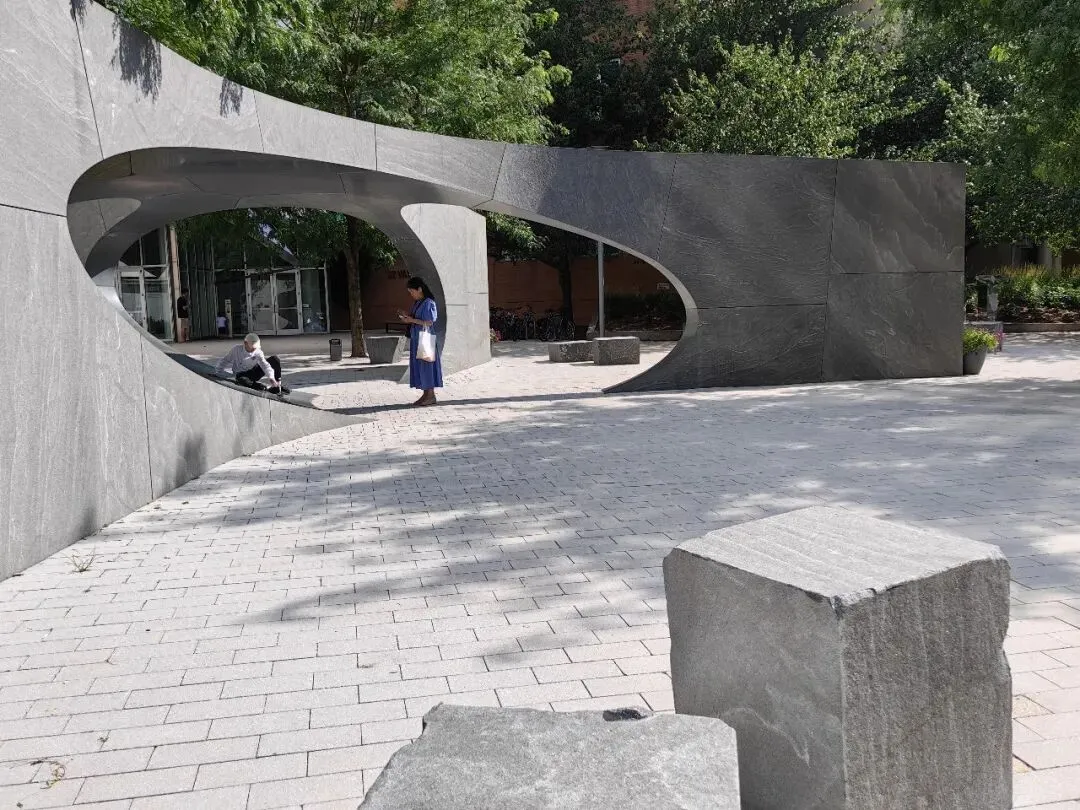 以一个永恒的结构标志着悲剧的现场一通过团结的力量的概念。纪念碑由32块坚固的花岗岩块组成,形成一个五向的石拱门。每个区块都支撑另一个区块,以创建一个中央的、覆盖的空间用于反射。灵感来源于张开的手势,由五面向外延伸的弧形墙支撑,向校园外延伸。位于放射状墙体中心处的卵形空间形成了一条通道、一个标识以及一个光圈,从而对场地进行了重新布局。