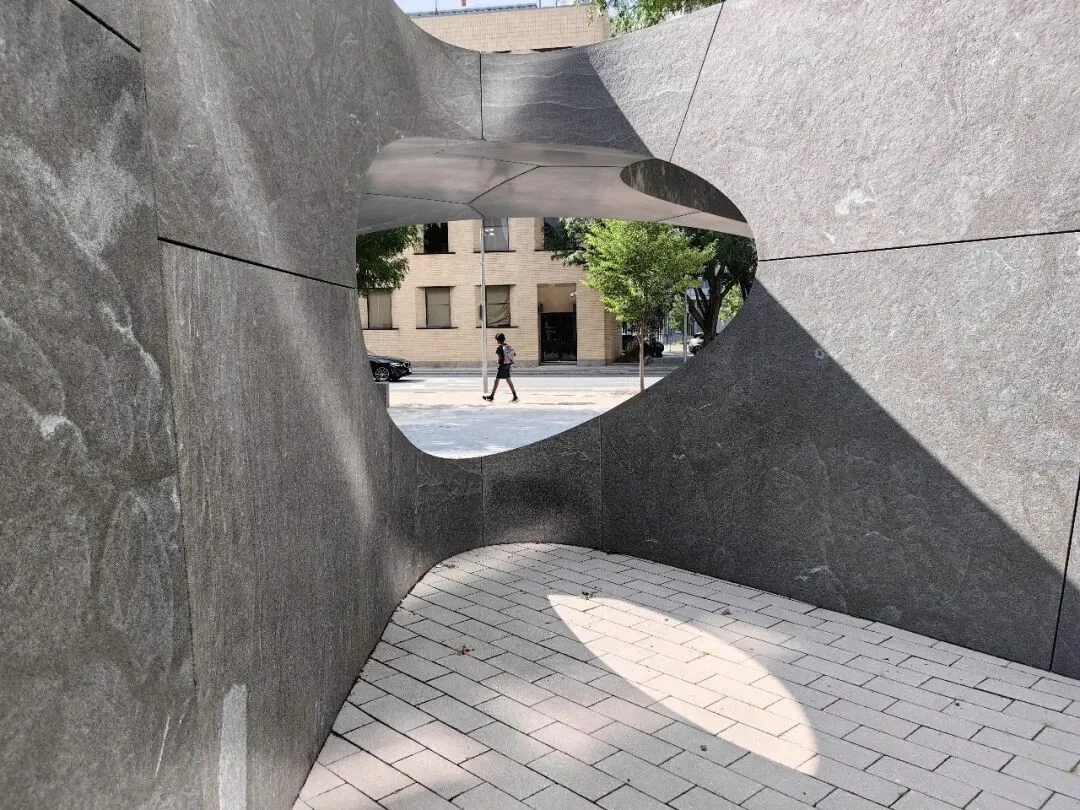 这座纪念碑的设计将古老的跨越砖石拱顶的结构技术与新生的数字制造与结构计算技术相结合,从而创造出一种前所未有的形态。石拱是最为基本的结构构造形式之一,它能将材料在空间中进行排列,并将力转化为形态。设计依赖于32块石块的精确契合,以实现荷载在纯压缩状态下从一块石头传递至另一块石头。上方巨大石拱的浅度营造出一种悬垂与失重的效果,而构成压缩环的各块石块的锥形几何形态则揭示了砖石拱顶的关键石构构造