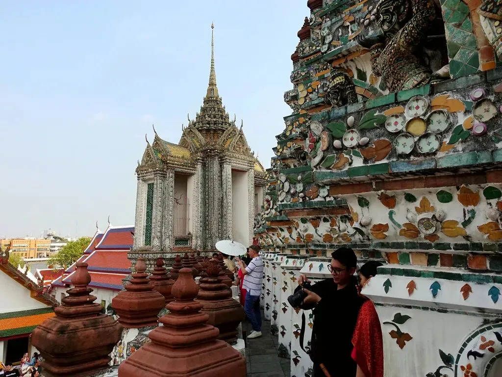 郑王庙是10元泰铢硬币的背景图案,据说塔身上贴的是中国商船压舱的瓷片玻璃贝壳。现在只能爬到第二层,并不能如攻略所说俯瞰湄南河和大皇宫。更高层的台阶非常陡峭不允许攀爬。整体上可以拍摄佛塔群,近景尅拍摄塔基塔座上的神兽雕像,此处穿泰服拍照的特别多,估计是比较容易出片吧。景区内还有其他宫殿和佛塔可以参观。入口街巷单向行驶,非常狭窄容易堵车。