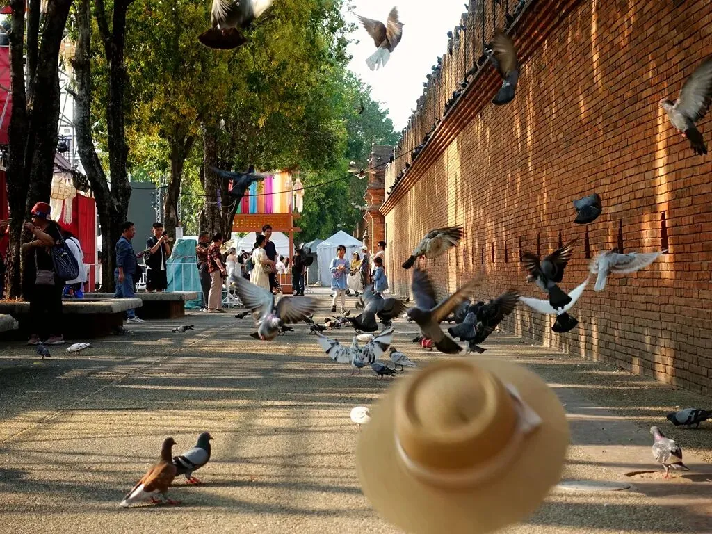 塔佩门是清迈古城的东门,据说是保存最完整的古城门。不过如果你到了现场,会感觉它更像寨门,城门是两扇木质大门,城墙看起来像是后来用新砖修补的。打车经过古城的时候,能看到还是有保留下来的古城墙的。塔佩门的城墙下,有很多人在拍鸽子,当然鸽子是陪衬,更多的是拍鸽群飞舞衬托下的人类。摄影师在地面撒下谷物,把城墙上的鸽子吸引下来,再甩下塑料桶把鸽子惊飞,就拍出来鸽群飞舞的视频和照片了。