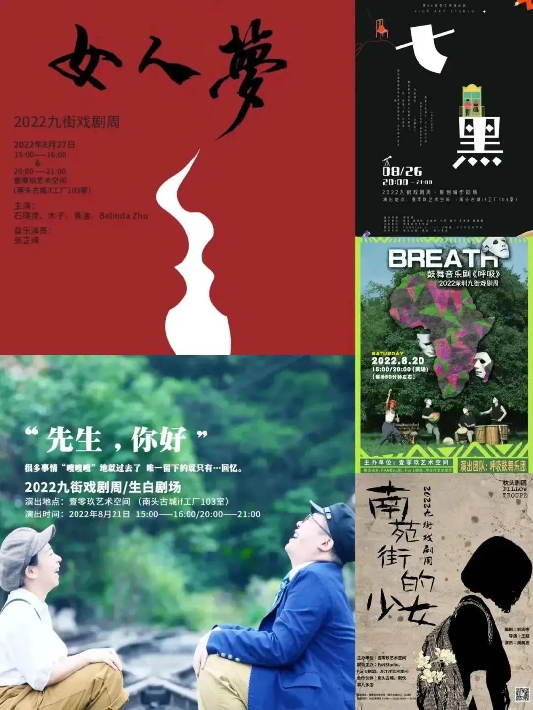 8月20日-8月28日期间,来自各地的优秀剧团共聚南头古城if工厂壹零玖艺术空间,上演鼓舞剧《呼吸》、生白剧场《先生你好》、经典再演绎《女人梦》、原创编作剧场《七·黑》、枕头剧团原创独角戏《南苑街的少女》。