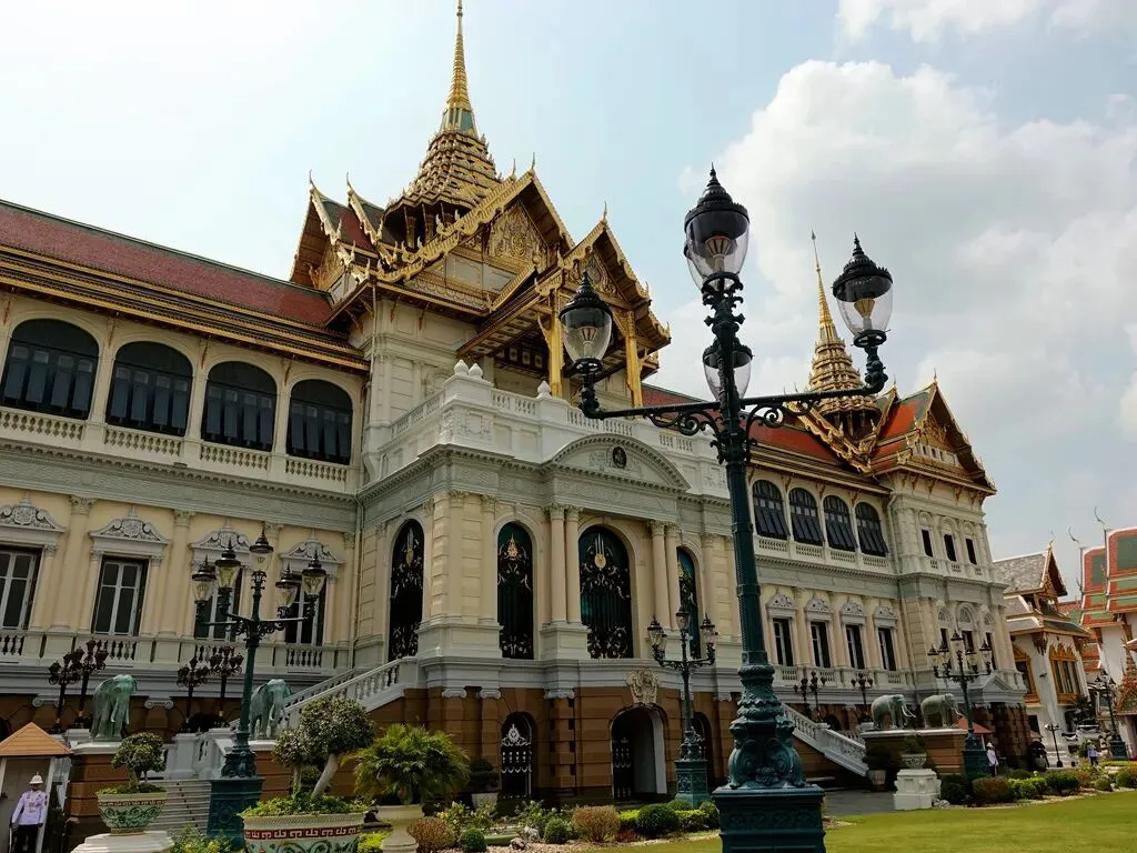 大皇宫主殿节基殿,上泰下欧融合风格,顶层泰式三尖顶,底层新古典主义欧式立柱。律实宫是最古老的柚木宫殿,殿前舍利塔耗费250公斤黄金打造,其他建筑路过看看就好。大皇宫游览路线拐弯处,可以拍摄建筑群全景,有缘还可以拍到皇家卫队换岗。可以在侧面拍摄宫殿群全景,有机会还能拍到鸽子飞过。