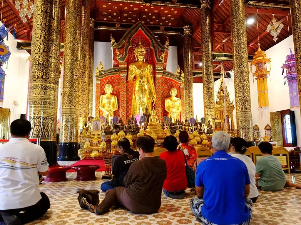 契迪龙寺门票50泰铢,正殿里可以捐赠20泰铢,自取薄薄的金箔贴在佛像上,还可以捐赠100泰铢,在祈福锦带上写下祝福和名字,挂在大殿中间的绳索上,祈福体验感满满,这谁能扛得住呀。清迈寺庙的佛殿内都会铺着地毯,人们安静地坐在地上拜佛沉思祈祷。