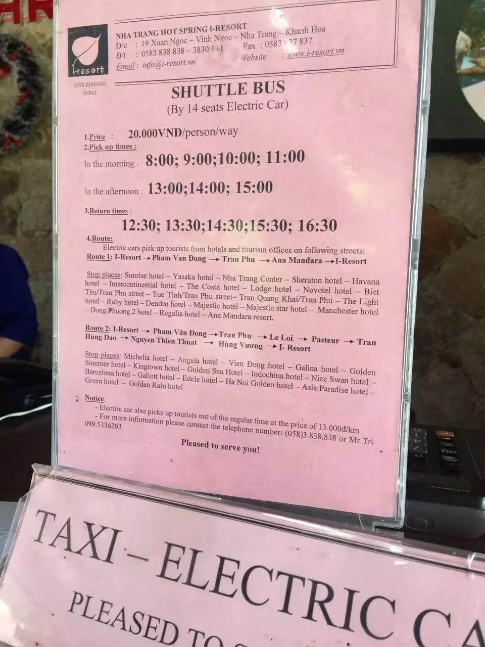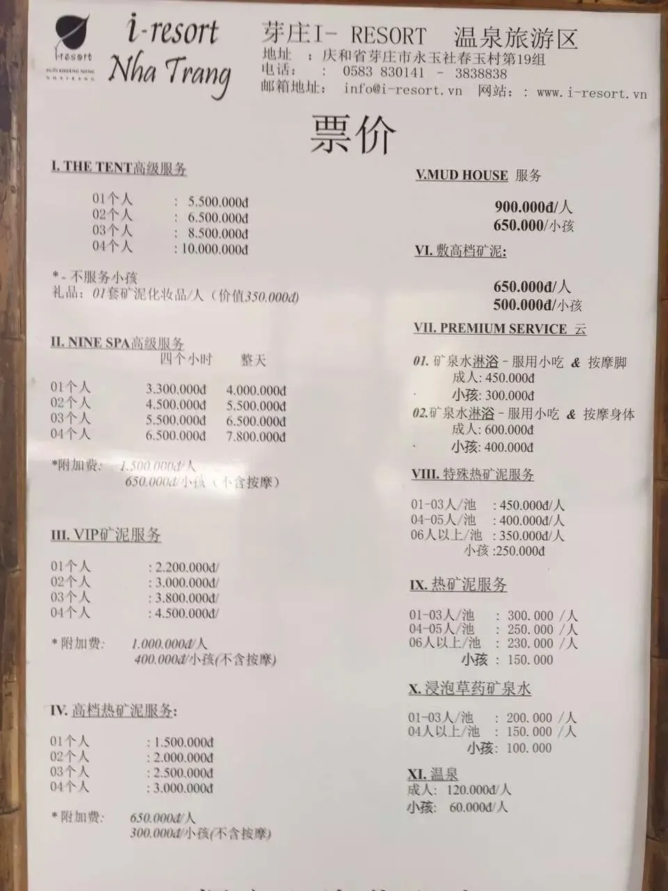 泥浆浴推荐I-resort,也是当地最有名的泥浆浴了,比各种导游推销给你的泥浆浴会所要好太多了。同样的,你也可以在淘宝上订购I-resort,同样比直接到现场买票要便宜一点,只需要到门口售票处出示截图上的密码就行。I-resort每天有各大酒店接送的班车,只需要2万越南盾(相当于人民币6元左右),班车时刻和路线上的酒店名字“翼翼申辉”给大家送上截图,以供大家参考。因为我当时是睡到很晚才去,所以是打车过去的,单程越南盾15万(人民币50元左右)。回程我则选择了班车回酒店,结果发现竟然是类似中国旅游景区的电瓶车直接上了马路,把我们送回了酒店,也算是一次难得的体验了。