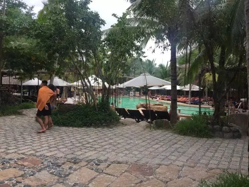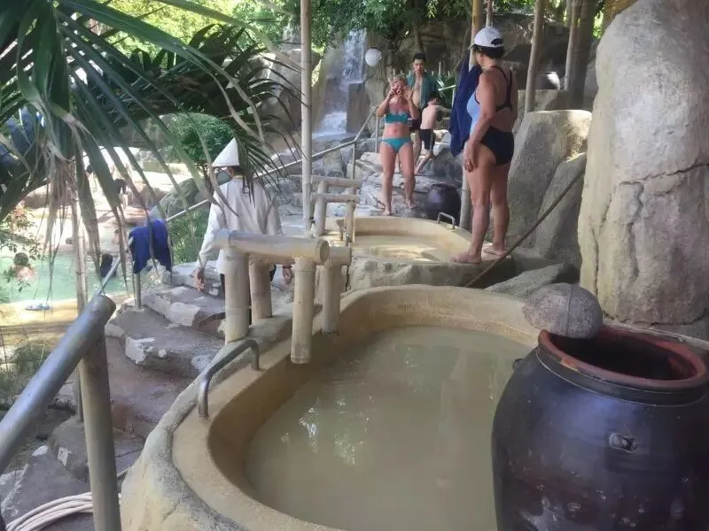 泥浆浴泡完,冲洗干净后,可以继续泡温泉游泳池。I-resort里有很多个不同的温泉泳池,温度各不相同,还有不少的瀑布,大家可以各取所需。景区里也有餐厅和酒吧,价格也还可以,一份套餐人民币60元左右。“翼翼申辉”把I-resort泥浆浴景区的价目表也贴在下面,大家可以和淘宝的价格进行一下对比,看看各自需要什么样的选择。