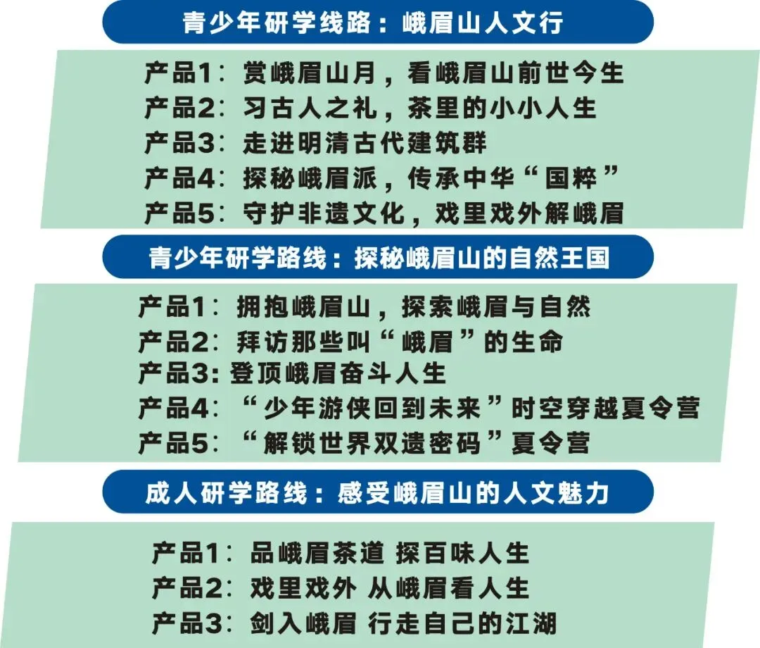 以“峨眉学”为引领,依托峨眉山双遗产资源,以“一景区、一营地、N基地、多线路”为整体架构,推出自然、古建、诗词、武术四大类目为主的研学产品体系。