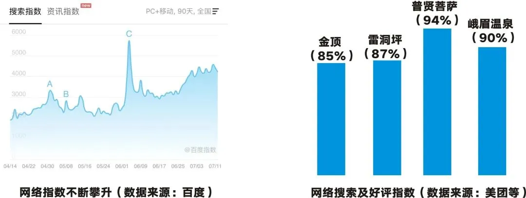 峨眉山景区网络指数不断攀升,网络搜索及好评指数也十分可观。
