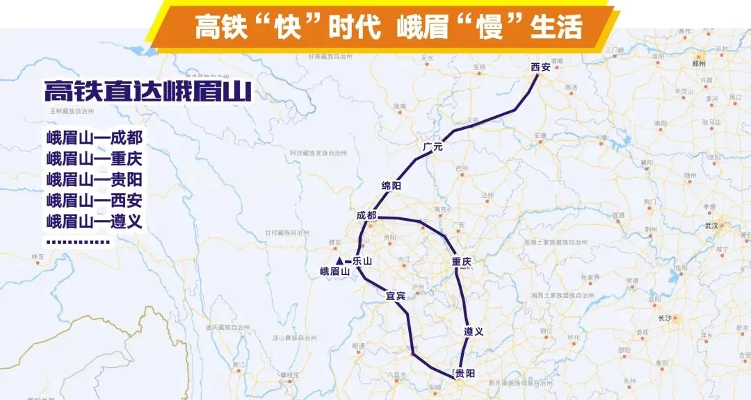 成都、重庆、贵阳、西安等地均开通峨眉山直达高铁,从此游峨眉山更加快捷。