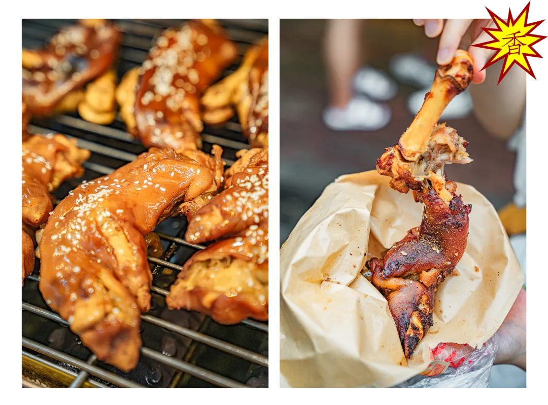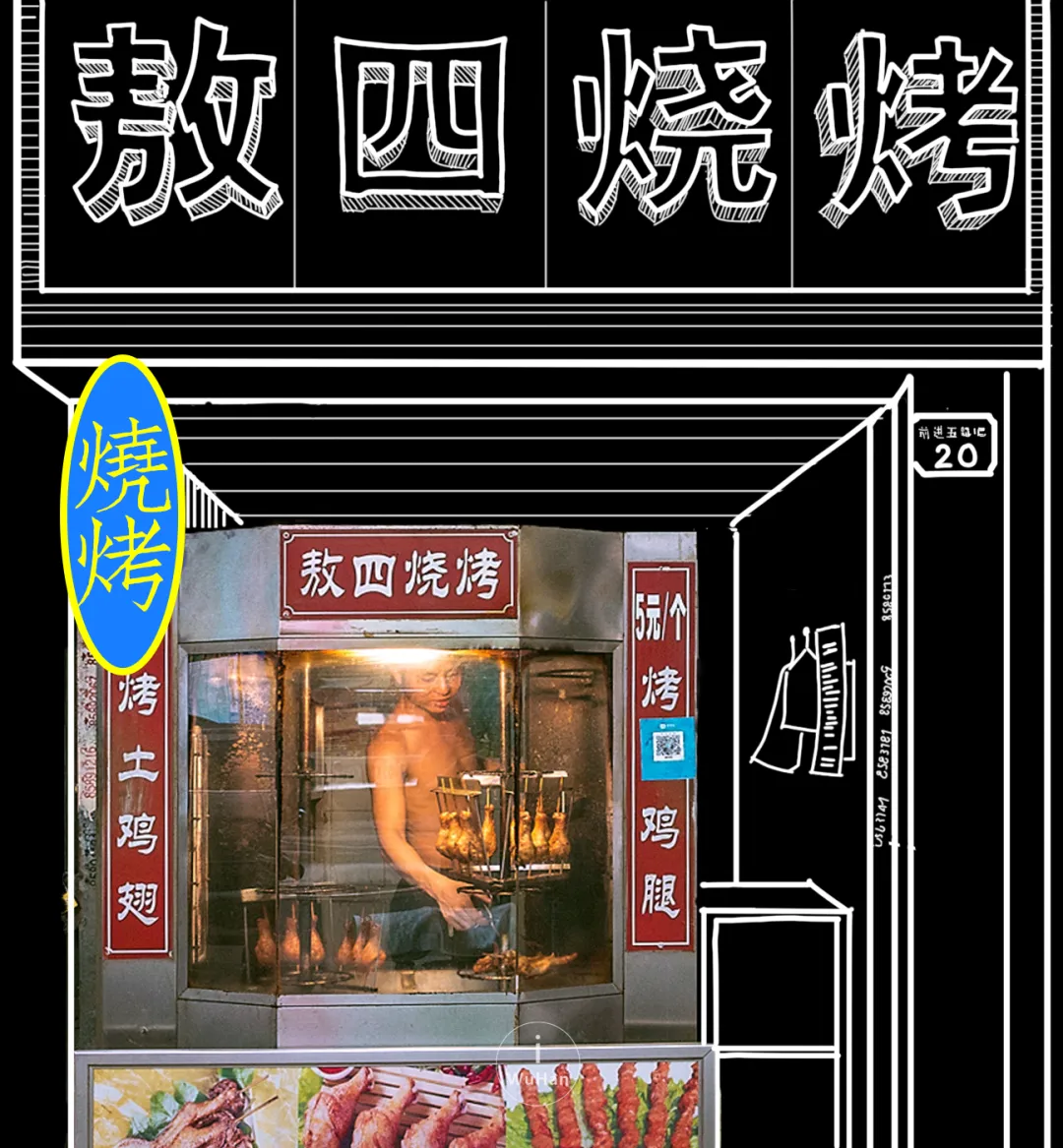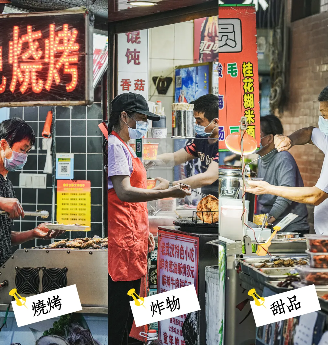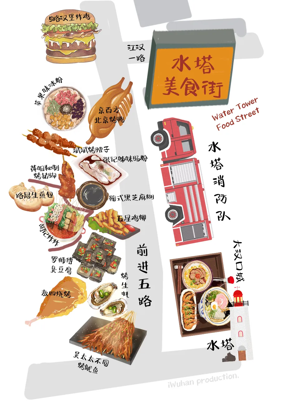 武汉的生煎包吃个皮厚馅小,吃的就是底下那层焦香。 小路易当年的到来一改武汉人对生煎的认知,原来“汤包”煎着吃也挺不错。带汤、皮薄、陷大,包子褶这面煎至焦黄,4个一份,份量刚好。 猪蹄这种东西,放在年夜饭的餐桌上都是硬菜,在小吃街吃合适吗?放心,绝对合适。 天然中草药秘制配方,满满都是胶原蛋白,不觉油腻。猪蹄烤至焦香脱骨,一扯就能扯下来,女孩子街边啃猪蹄也啃得优雅。 谁说芝麻糊只属于冬天,鞠氏的冰镇芝麻糊绝对是你夏天期待的古早味。专营芝麻糊当然有过人之处,不同于冲泡出来的,鞠氏芝麻糊磨得细腻,入口顺滑,甜而不腻。 水塔美食街迎合武汉人的重口味,几乎家家都重油重盐,姊妹肠粉恰如其分中和了口味的偏差值。 上十种可供选择,最贵不过21元,梦回广州。地不地道见仁见智,暂时一解对广州美食的馋绰绰有余。有趣的是,肠粉也躲不过武汉人重口味的习性,老板装盘后习惯性会问:加不加辣。 从最早的工艺大楼天桥下到现在水塔美食街路口,吴太大不同分店不少,但还是这家最地道。 将近二十年没有变过的风格、味道、人员配置。从只卖鱿鱼,到如今上十种串,铁板还是那个铁板,阿姨手中拿的还是那把三角小铁锹。 羊腰带羊油,选料肥瘦搭配刚好,膻味正。老板烤得认真,一串腰子该嫩的位置嫩,该焦的位置焦。 焦香与孜然香混合,顺带一口羊油爆浆的惊喜,如果喜欢吃羊一定不能错过。 水塔美食街做冰粉的不少,但一定要选一家的话不妨往里头走走,拐个弯选择苹果妹。 手工冰粉每日现做,除了传统红糖糍粑冰粉的各种衍生,苹果妹还玩出了很多新式冰粉。加入榴莲果泥、加入八喜冰淇淋、加入阿华田,每一款都有惊喜。 卤肉卷吃腻了,换个烤鸭卷plus吃吃看。这家专卖北京烤鸭的店,除了烤鸭同时贩卖烤鸭周边。 刚刚烤好片下来的鸭肉和烤鸭皮,再加入生菜黄瓜等辅料,铺上满满正宗京味甜面酱,北京人都没吃过的北京味诞生了。 小吃街怎么能少了炸鸡,从普通小店到如今火出圈,5路汉堡炸鸡当然是水塔美食街的头号炸鸡选手。 招牌酱炸鸡现点先做,拿到手里热腾腾的,酱料又辣又甜用量恰好,既保留炸鸡原本的酥香,也不失酱料的特别。就着冰啤酒一起,夏天的幸福不过如此。 水塔美食街不提敖四烧烤,那是会被武汉吃货们群体diss的。 “5元/个烤土鸡腿”的宣传语,以及被油烟熏得不那么亮堂的招牌是敖四烧烤的标志,透明烤炉里永远上演着“旋转土鸡腿”的梦幻戏码。 图片|阿颜 设计|套娃、JUNONE 出品|武汉爱黑马文化传媒