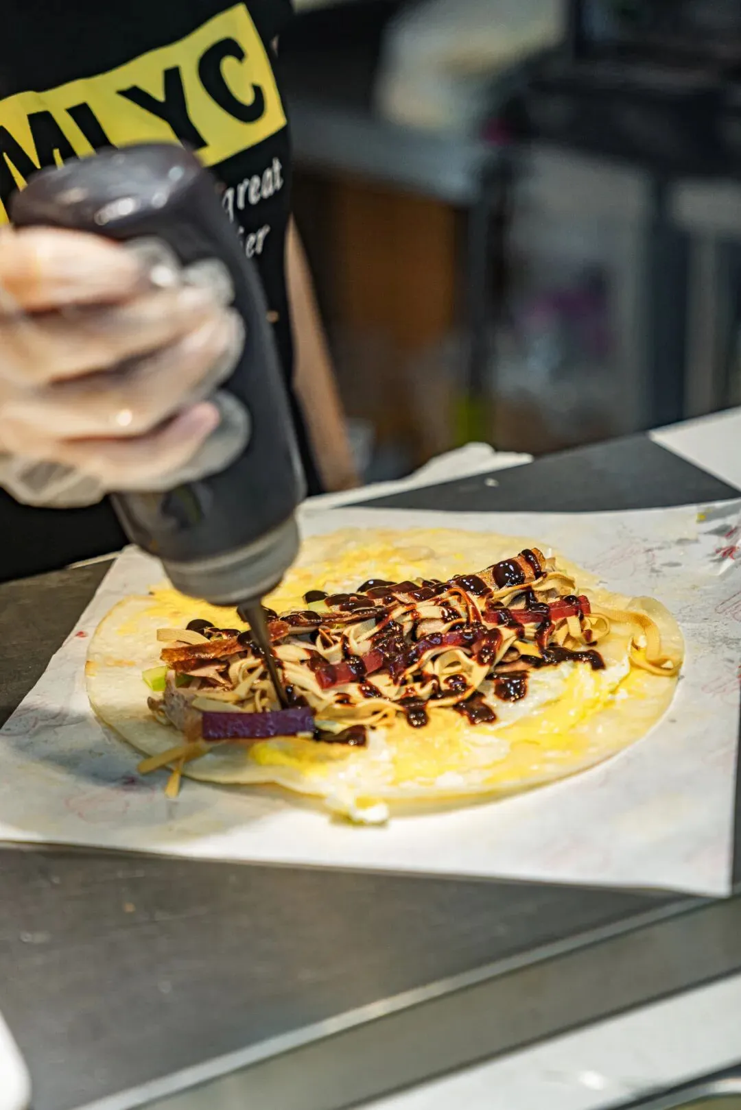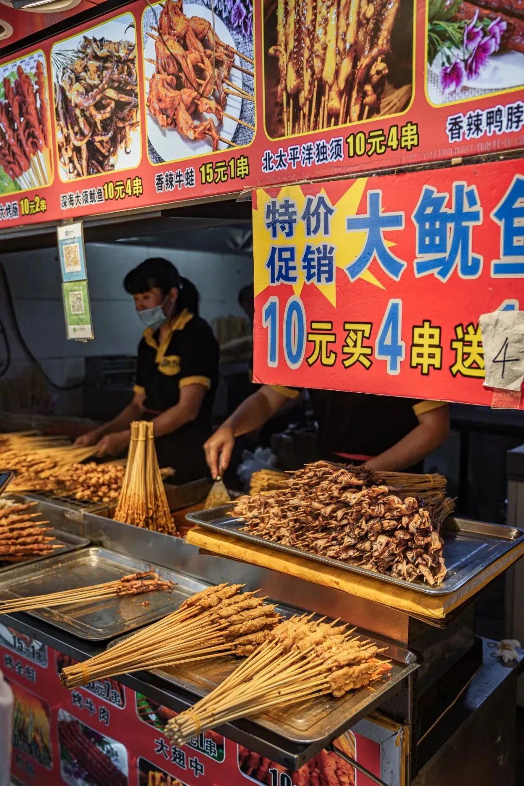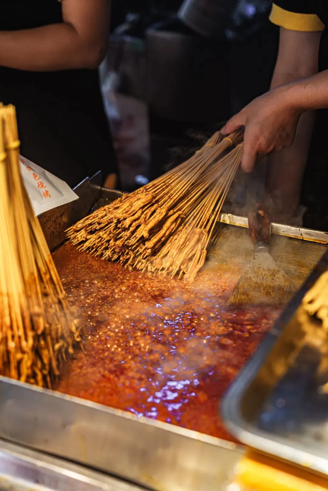 武汉的生煎包吃个皮厚馅小,吃的就是底下那层焦香。 小路易当年的到来一改武汉人对生煎的认知,原来“汤包”煎着吃也挺不错。带汤、皮薄、陷大,包子褶这面煎至焦黄,4个一份,份量刚好。 猪蹄这种东西,放在年夜饭的餐桌上都是硬菜,在小吃街吃合适吗?放心,绝对合适。 天然中草药秘制配方,满满都是胶原蛋白,不觉油腻。猪蹄烤至焦香脱骨,一扯就能扯下来,女孩子街边啃猪蹄也啃得优雅。 谁说芝麻糊只属于冬天,鞠氏的冰镇芝麻糊绝对是你夏天期待的古早味。专营芝麻糊当然有过人之处,不同于冲泡出来的,鞠氏芝麻糊磨得细腻,入口顺滑,甜而不腻。 水塔美食街迎合武汉人的重口味,几乎家家都重油重盐,姊妹肠粉恰如其分中和了口味的偏差值。 上十种可供选择,最贵不过21元,梦回广州。地不地道见仁见智,暂时一解对广州美食的馋绰绰有余。有趣的是,肠粉也躲不过武汉人重口味的习性,老板装盘后习惯性会问:加不加辣。 从最早的工艺大楼天桥下到现在水塔美食街路口,吴太大不同分店不少,但还是这家最地道。 将近二十年没有变过的风格、味道、人员配置。从只卖鱿鱼,到如今上十种串,铁板还是那个铁板,阿姨手中拿的还是那把三角小铁锹。 羊腰带羊油,选料肥瘦搭配刚好,膻味正。老板烤得认真,一串腰子该嫩的位置嫩,该焦的位置焦。 焦香与孜然香混合,顺带一口羊油爆浆的惊喜,如果喜欢吃羊一定不能错过。 水塔美食街做冰粉的不少,但一定要选一家的话不妨往里头走走,拐个弯选择苹果妹。 手工冰粉每日现做,除了传统红糖糍粑冰粉的各种衍生,苹果妹还玩出了很多新式冰粉。加入榴莲果泥、加入八喜冰淇淋、加入阿华田,每一款都有惊喜。 卤肉卷吃腻了,换个烤鸭卷plus吃吃看。这家专卖北京烤鸭的店,除了烤鸭同时贩卖烤鸭周边。 刚刚烤好片下来的鸭肉和烤鸭皮,再加入生菜黄瓜等辅料,铺上满满正宗京味甜面酱,北京人都没吃过的北京味诞生了。 小吃街怎么能少了炸鸡,从普通小店到如今火出圈,5路汉堡炸鸡当然是水塔美食街的头号炸鸡选手。 招牌酱炸鸡现点先做,拿到手里热腾腾的,酱料又辣又甜用量恰好,既保留炸鸡原本的酥香,也不失酱料的特别。就着冰啤酒一起,夏天的幸福不过如此。 水塔美食街不提敖四烧烤,那是会被武汉吃货们群体diss的。 “5元/个烤土鸡腿”的宣传语,以及被油烟熏得不那么亮堂的招牌是敖四烧烤的标志,透明烤炉里永远上演着“旋转土鸡腿”的梦幻戏码。 图片|阿颜 设计|套娃、JUNONE 出品|武汉爱黑马文化传媒