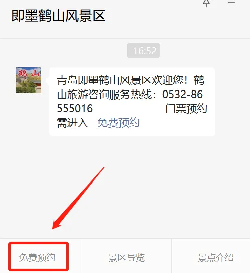 进入【即墨鹤山风景区】微信公众号,点击菜单栏【免费预约】即可进行预约。