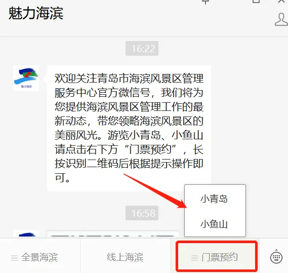 进入【魅力海滨】微信公众号,点击菜单栏【门票预约】即可进行预约。