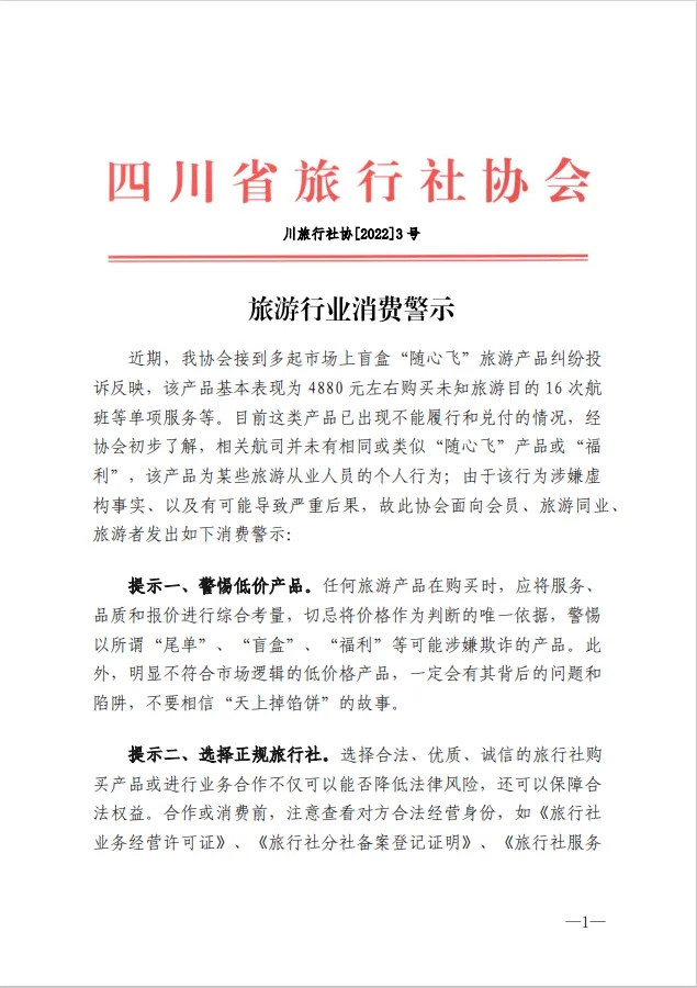 近期,我协会接到多起市场上盲盒“随心飞”旅游产品纠纷投诉反映,该产品基本表现为4880元左右购买未知旅游目的16次航班等单项服务等。目前这类产品已出现不能履行和兑付的情况,经协会初步了解,相关航司并未有相同或类似“随心飞”产品或“福利”,该产品为某些旅游从业人员的个人行为;由于该行为涉嫌虚构事实、以及有可能导致严重后果,故此协会面向会员、旅游同业、旅游者发出以下消费警示:
