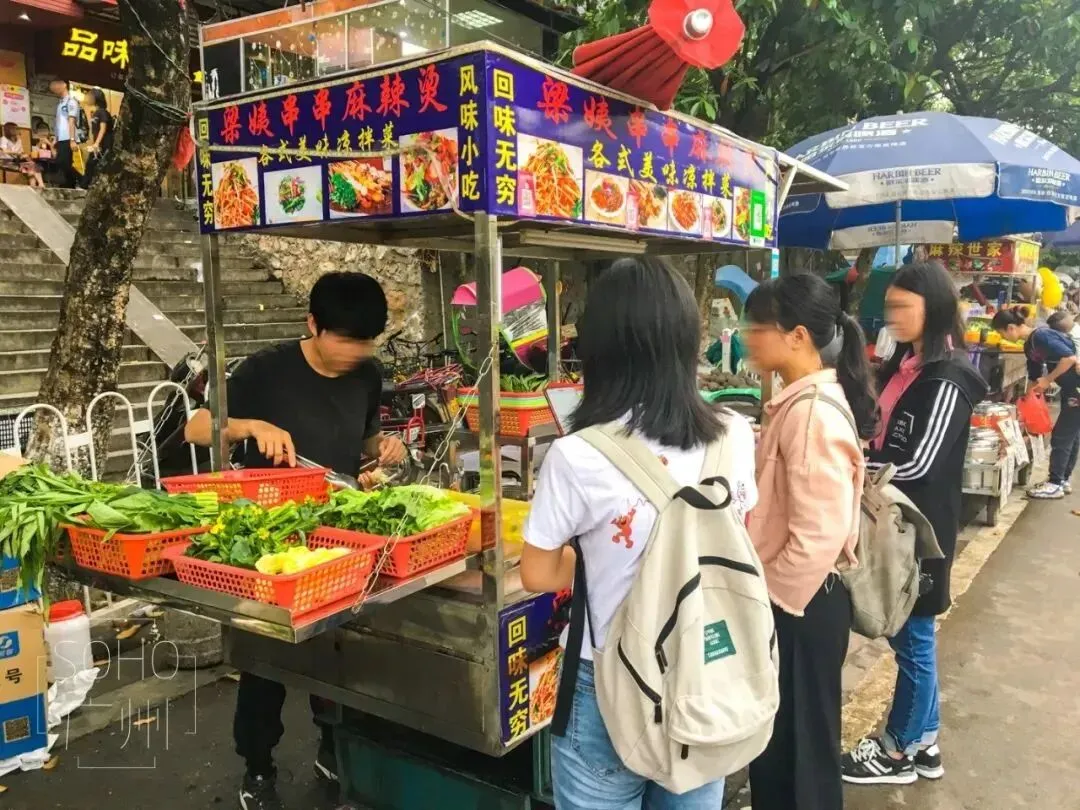 几条小小的街道却汇集了上百家美食店!五谷杂粮饼、水果捞、秘制豆腐、麻辣烫、烧烤等等