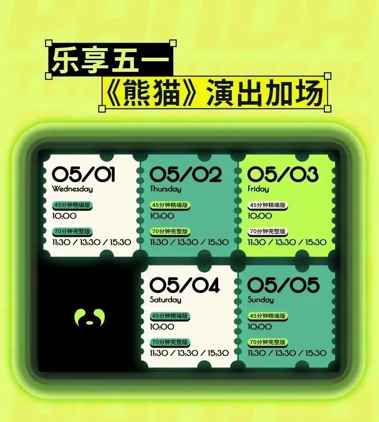 五一期间,每天还有全国首个以大熊猫为主题的创新型杂技剧《熊猫玩家》在度假区熊猫基地“熊猫玩家”主题场馆演出!该剧由世界级文化品牌、全球最受欢迎的太阳马戏团创作团队为成都量身打造,用独具魅力的传播方式,讲述地道的天府文化故事,是一场融合杂技、戏剧、舞蹈、视觉艺术、音乐等多种形式的欢乐演艺秀,也是一场结合杂技表演和文化探索的全新体验剧。