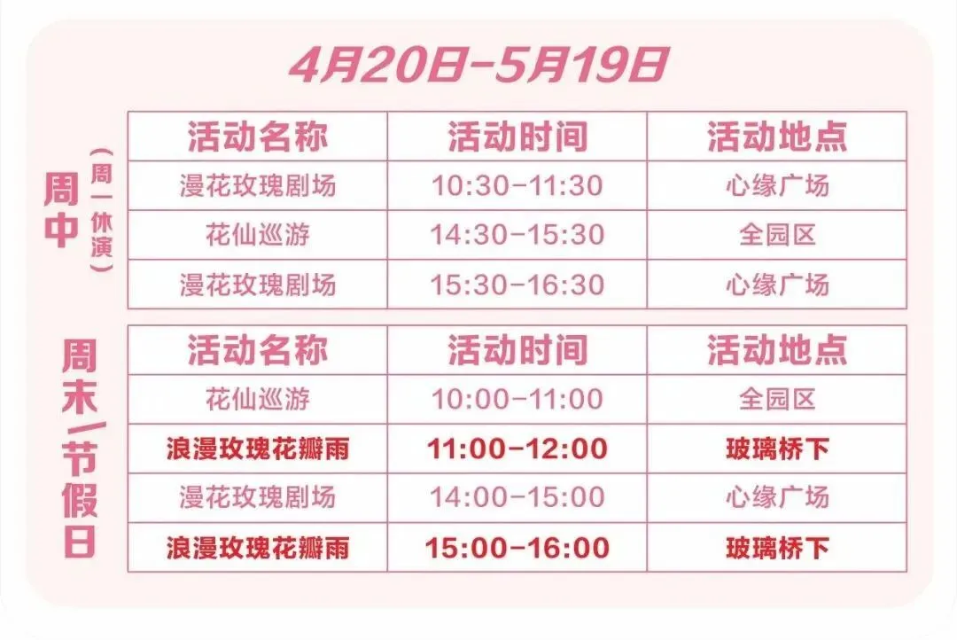 还有玫瑰季限定活动等你来参加~玫瑰花瓣雨每天两场(11:30、15:30)、打卡粉色火山、花仙巡游,还有剧情新奇的玫瑰剧场等你来观看,现场更有大型交友活动,走上舞台遇见你的“命中注定”。浪漫翻倍!幸福感爆棚!详情请戳下图了解↓