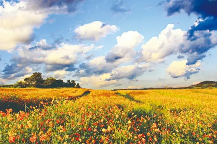 莲花山花海 天定山旅游度假小镇 九台马鞍山田园综合体 莲花山花海 今年,莲花山花海种植花卉的种类较去年增加了十多个品种,其中播种的花卉有百日草、孔雀草、金盏菊、鼠尾草、串红、马鞭草、假龙头、小丽花等。 花海大道沿途设有风景画框、大型标语立体字、圆木景墙、拱桥、游乐秋千、草雕等小品供游人游玩、观赏。农业园花卉区设有大型风车供游人观赏、拍照。