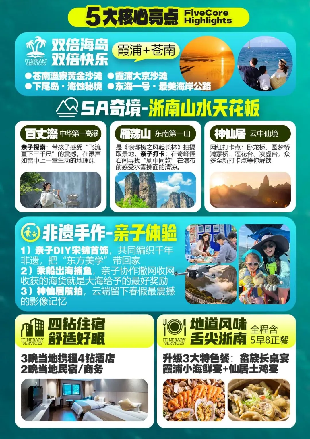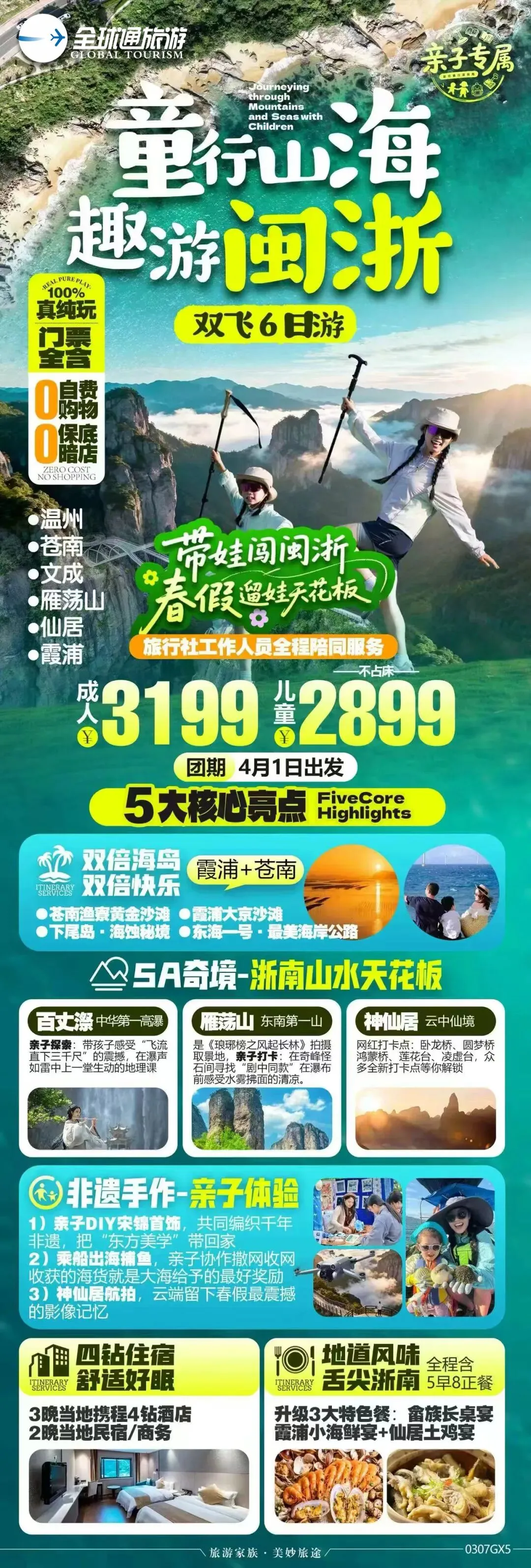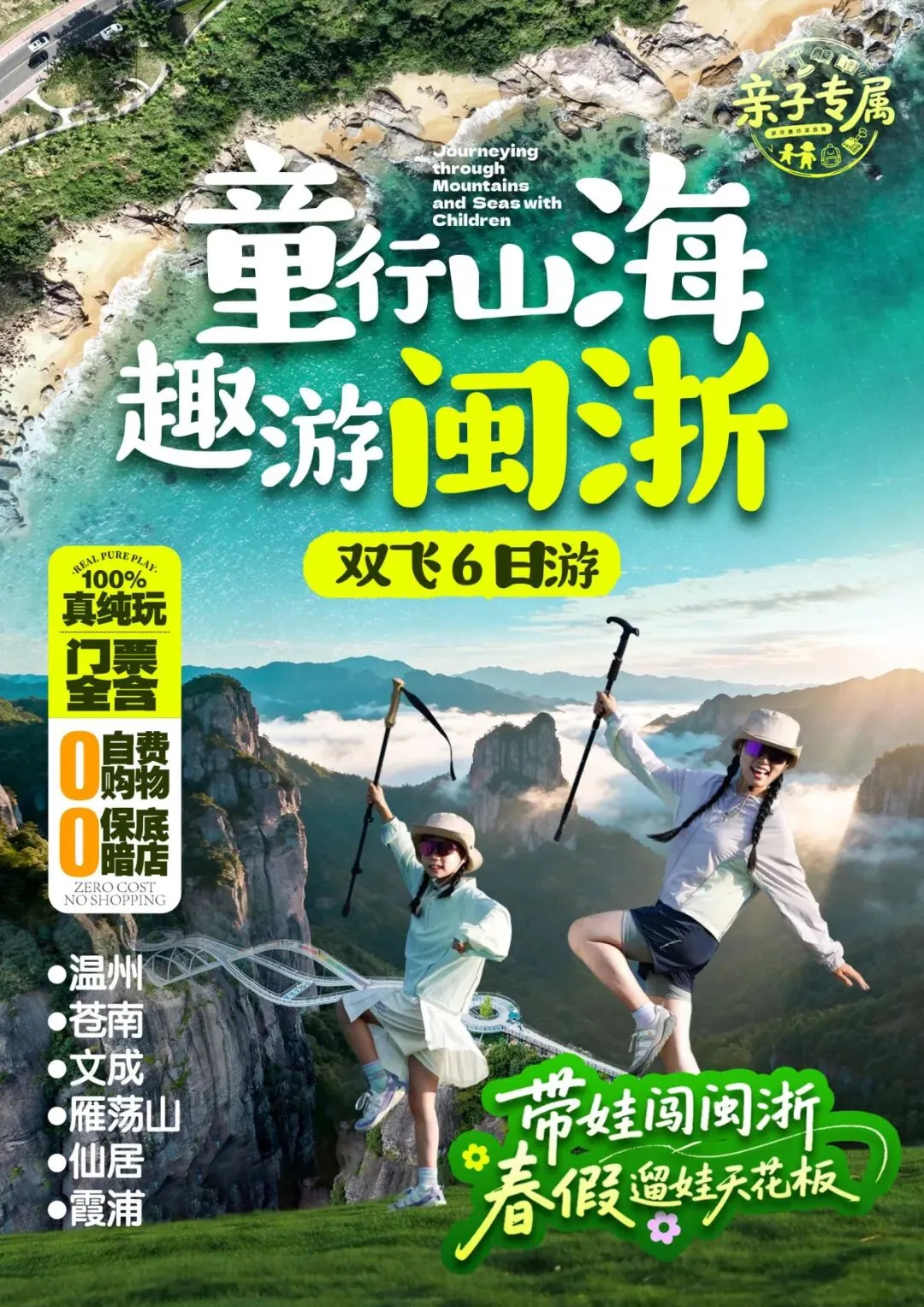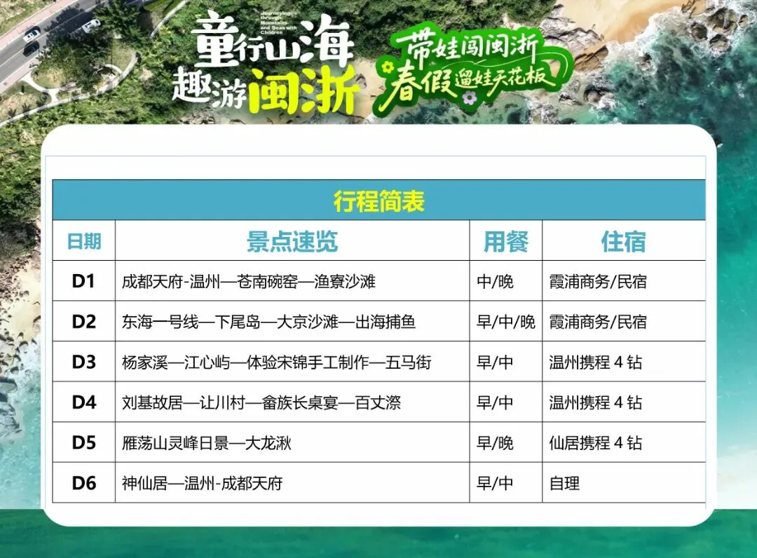 《童行山海·趣游闽浙双飞6天》,专为亲子家庭定制,用6天时间,带娃跳出书本,在山与海的拥抱里,解锁一场有玩、有学、有成长的春假奇遇!