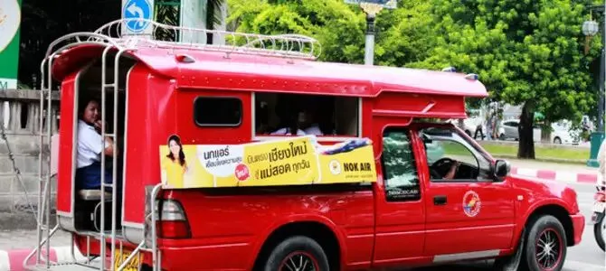 清迈的公交车为一种改装小货车,被称为Sawngthaew,后车厢两侧安装长凳。这种车没有固定线路,去任何地方都可以在同方向路边招车,司机一般都会说顺路,即使不顺路也会在其他乘客下车后送到目的地。市区内一般开价20泰铢/人。