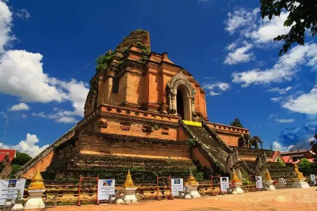 大佛塔寺的造型与别处都不同,这座宏大的四方形佛塔,高达85.4米,始建于1411年的兰纳式佛塔,1545年清迈发生了一次大地震,佛塔的尖顶被震毁。 佛塔体积非常巨大,佛塔分为四个方向,每个方向的造型都大致一样。大佛塔寺,也叫做契迪龙寺(Wat Chedi-Luang),佛塔下面这个形似‘五头龙’的石像更是震慑人心,造型奇特、工艺精湛、霸气十足。