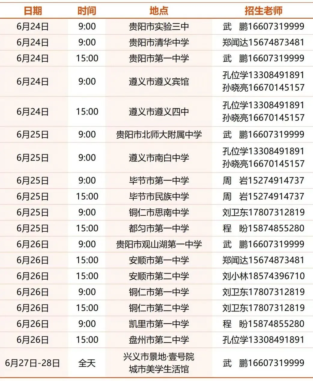 国防科技大学贵州招生组拟于近期前往贵阳、遵义、毕节、铜仁、都匀、安顺、凯里、盘州、兴义等地进行政策宣讲活动。具体安排如下: