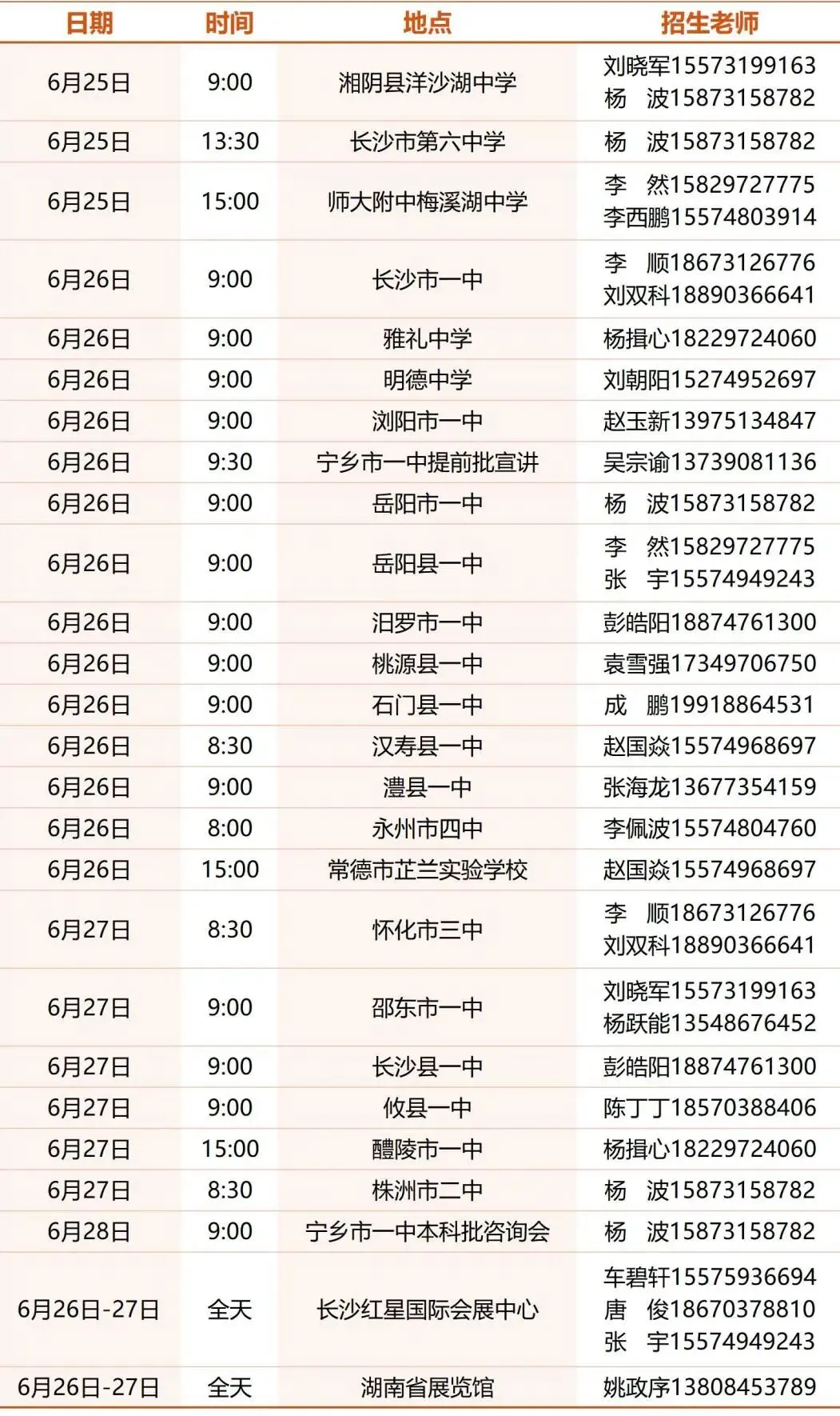 国防科技大学湖南招生组拟于近期前往长沙、岳阳、常德、永州、邵阳、怀化、株洲等地进行政策宣讲活动。具体安排如下: