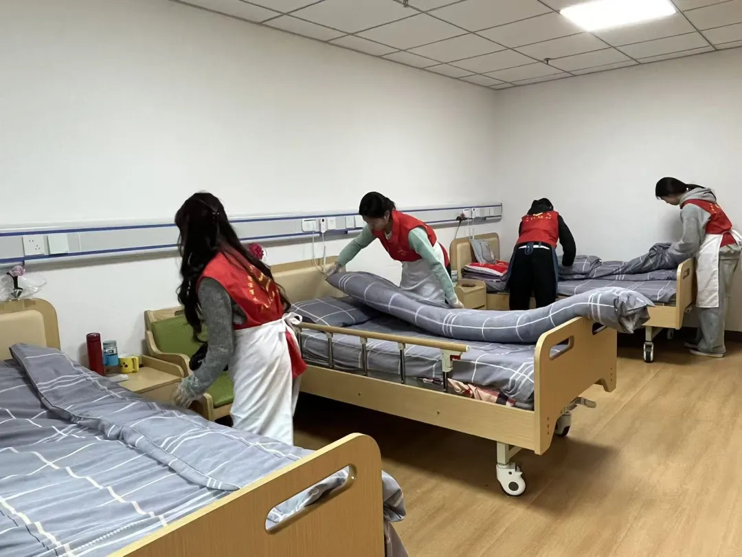 酒店管理专业师生深入老人居室,开展房间整理、床铺规整、物品收纳等服务。老师们现场示范标准铺床、日常收纳技巧,帮助我院工作人员提升服务品质与居住舒适度。整理完毕后,师生们围坐在老人身边拉家常、听故事,用陪伴驱散孤单,用真心传递温情。