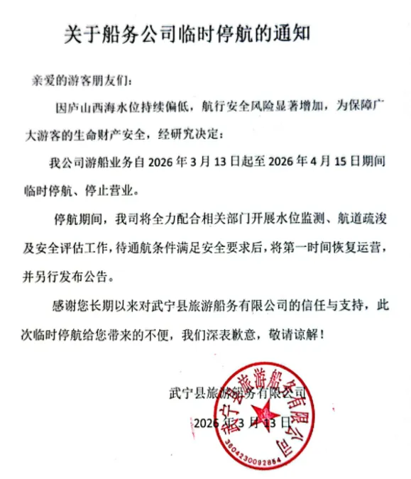 九江文旅一卡通运营中心接到合作景区观湖岛景区、观音岛景区的通知,因庐山西海水位持续偏低,航行安全风险显著增加,为保障广大游客的生命财产安全,经研究决定:观湖岛、观音岛景区游船业务自2026年3月13日起至2026年4月15日期间临时停航、停止营业。此次临时停航给您带来的不便,我们深表歉意,敬请谅解!