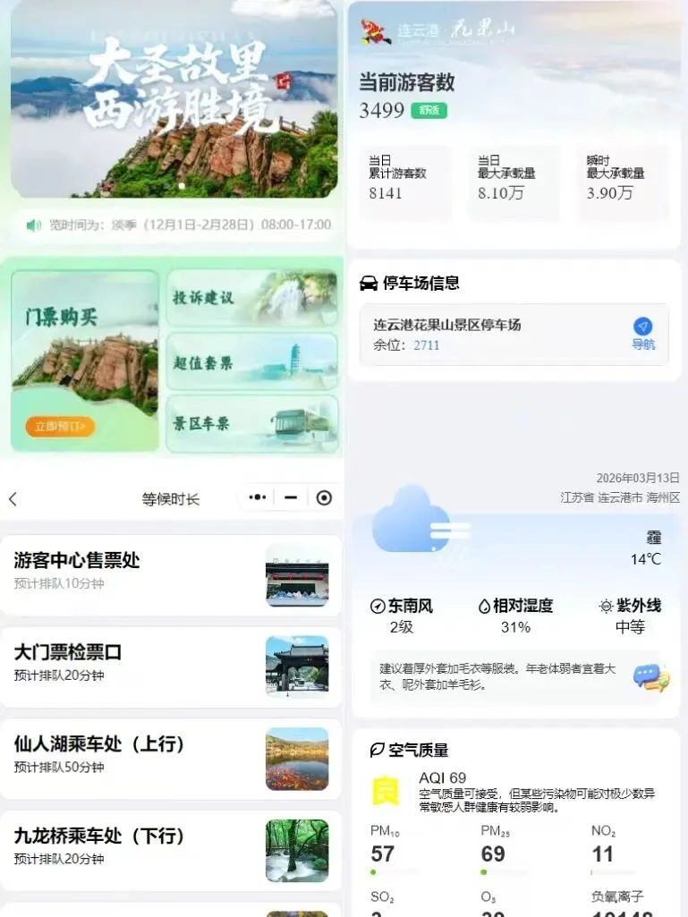 在游览过程中,智慧服务的身影也无处不在。走进景区,游客打开小程序就能看到实时更新的景区环境监测数据,温度、湿度、空气质量等指标一目了然,让游客能根据天气和环境情况调整游览节奏。“带着孩子来,能实时看到空气质量,心里更放心,也能更好地规划登山路线。”游客陈女士说。与此同时,景区小程序还实现了电子导览、导游讲解及真人导游预约功能,游客可随时收听景点的西游传说讲解,也能提前预约专业真人导游,深度感受花果山的文化底蕴。