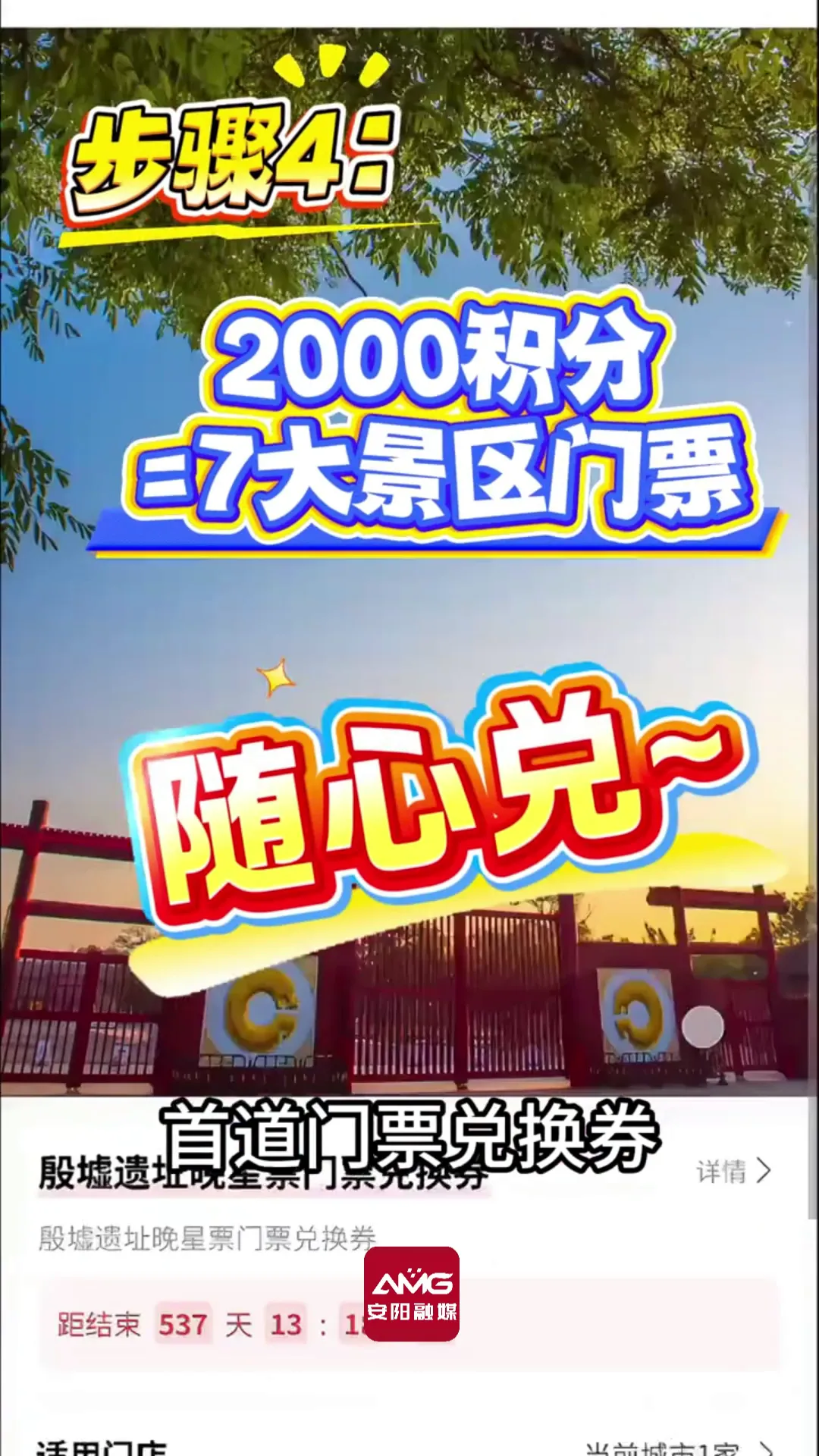 第四步,积分满2000分即可兑换殷墟博物馆、殷墟宫殿宗庙遗址、红旗渠景区、太行大峡谷、羑里城、岳飞庙、曹操高陵遗址博物馆七家热门景区的首道门票兑换券。(本次活动将持续至2027年5月31日)
