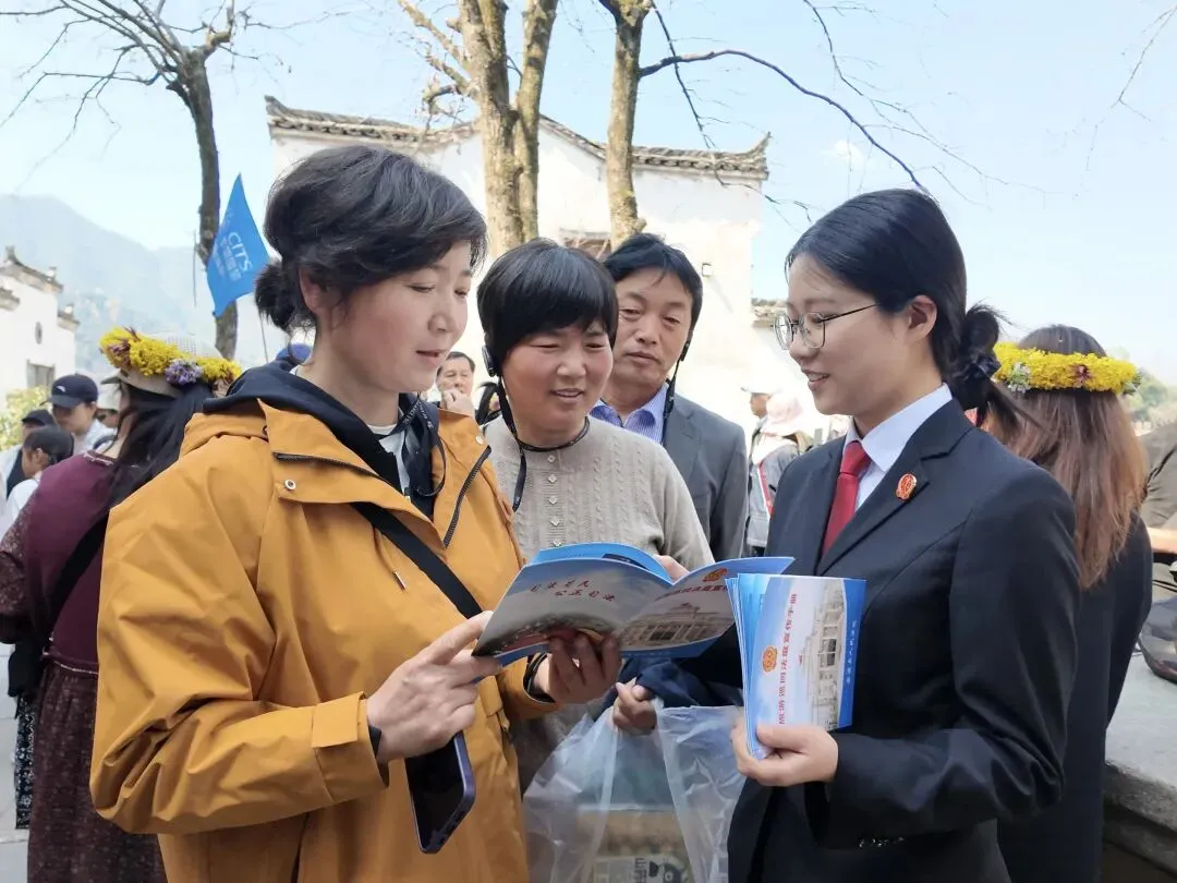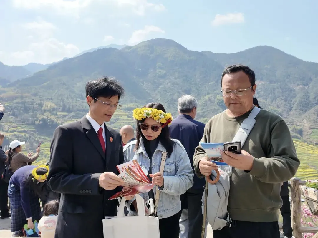 在景区人流密集处,法庭设立法律咨询服务台,干警们向过往游客发放《旅游巡回法庭宣传手册》《民法典宣传手册》等宣传资料200余份,针对游客关心的“意外受伤责任划分”等问题,提供“一对一”法律咨询30余人次,让游客们在欣赏乡村美景的同时,真切感受法治春风的温暖。