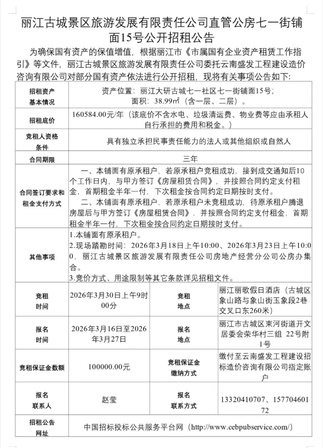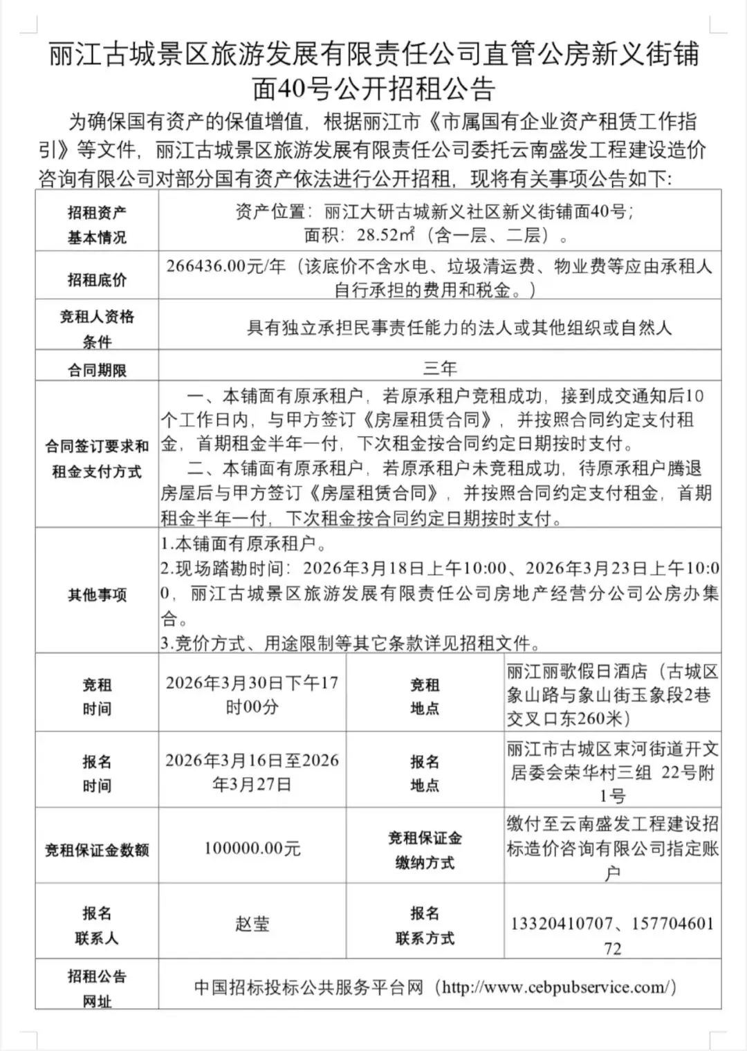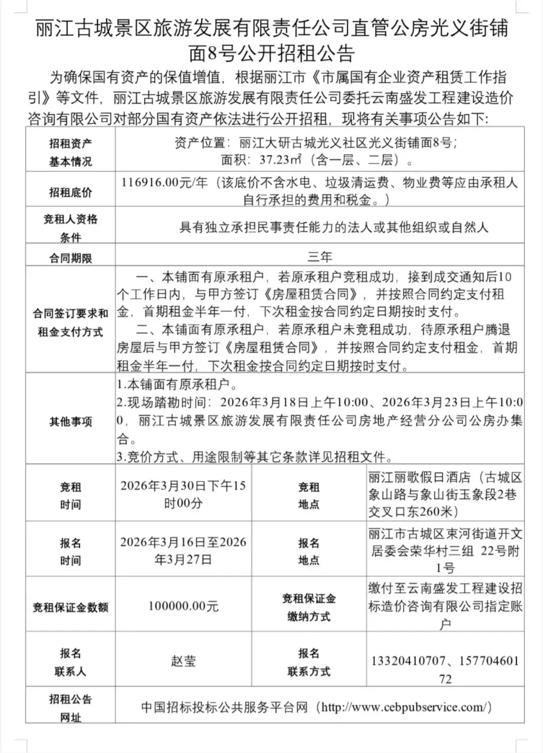 丽江古城景区旅游发展有限责任公司直管公房公开招租