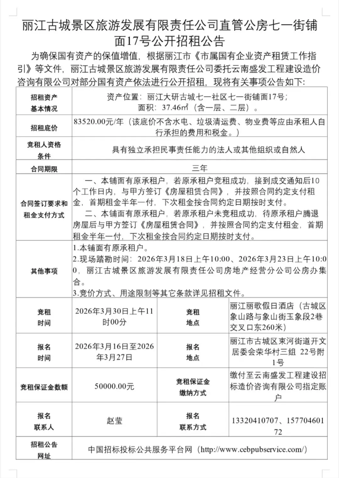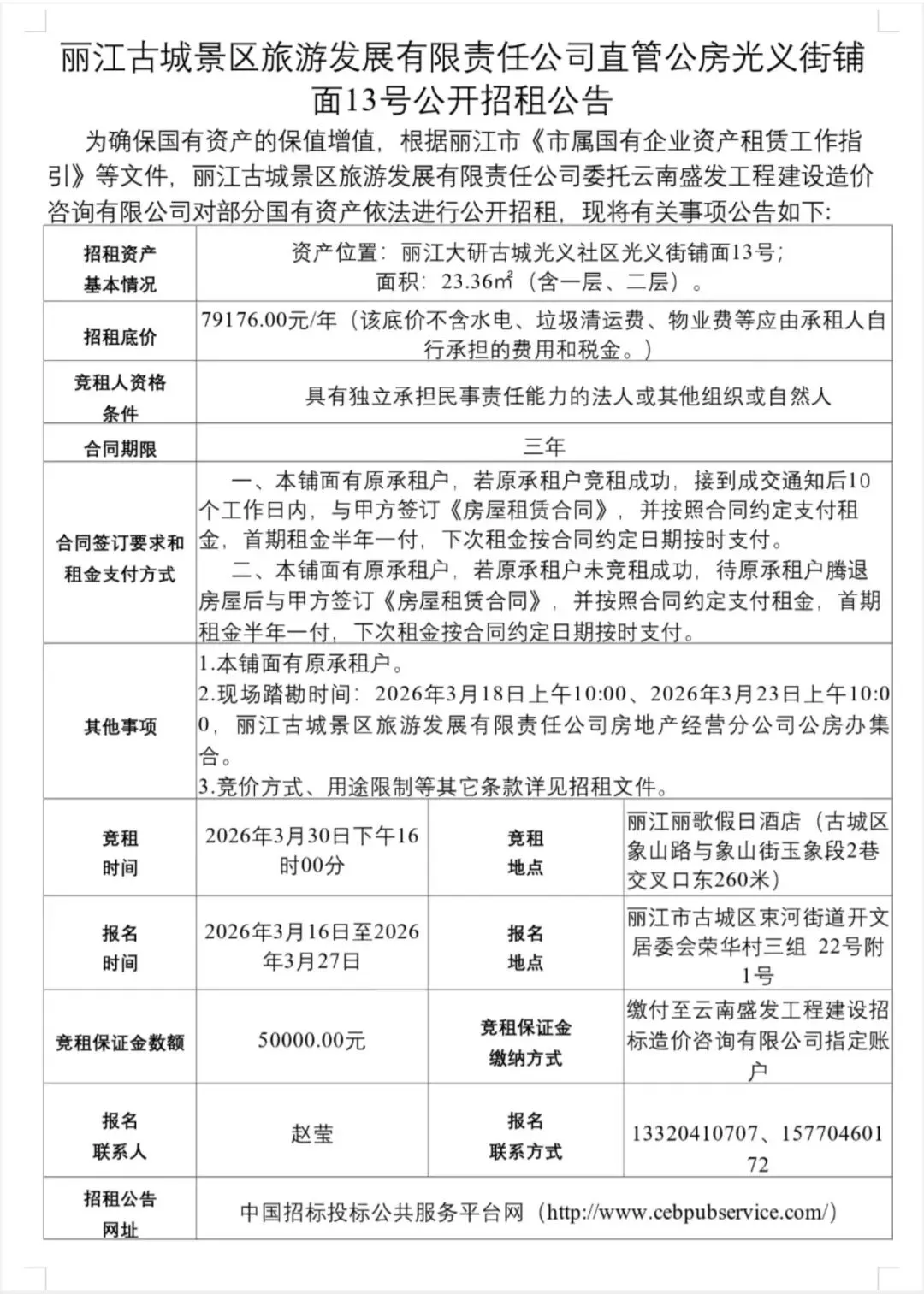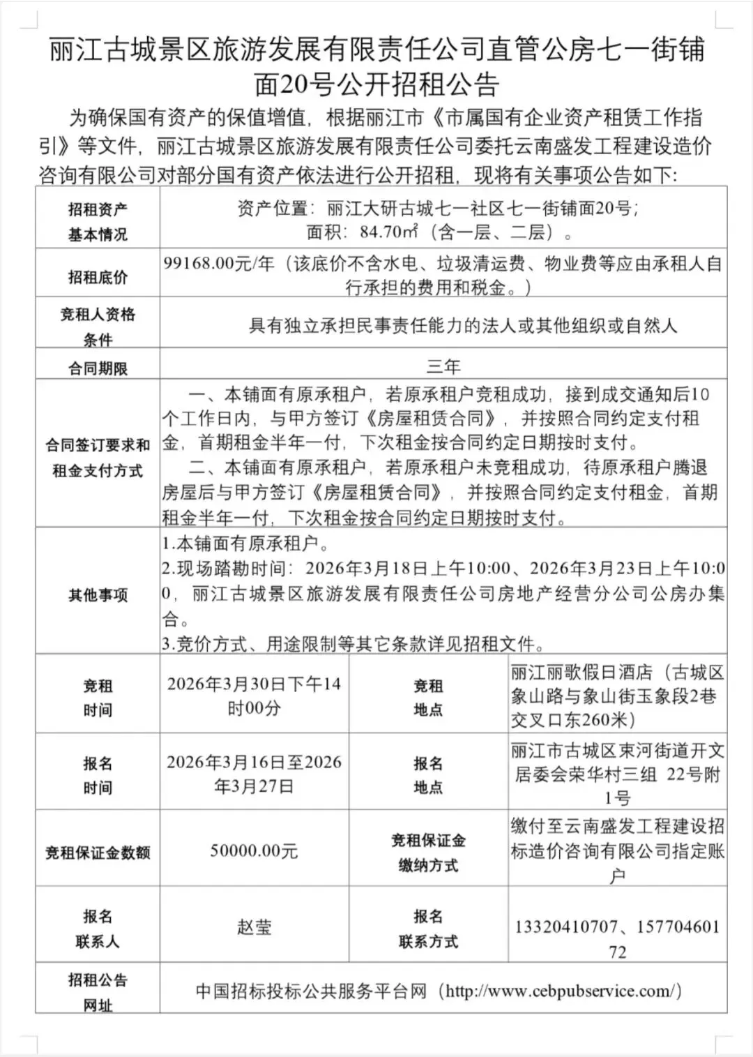 丽江古城景区旅游发展有限责任公司直管公房公开招租