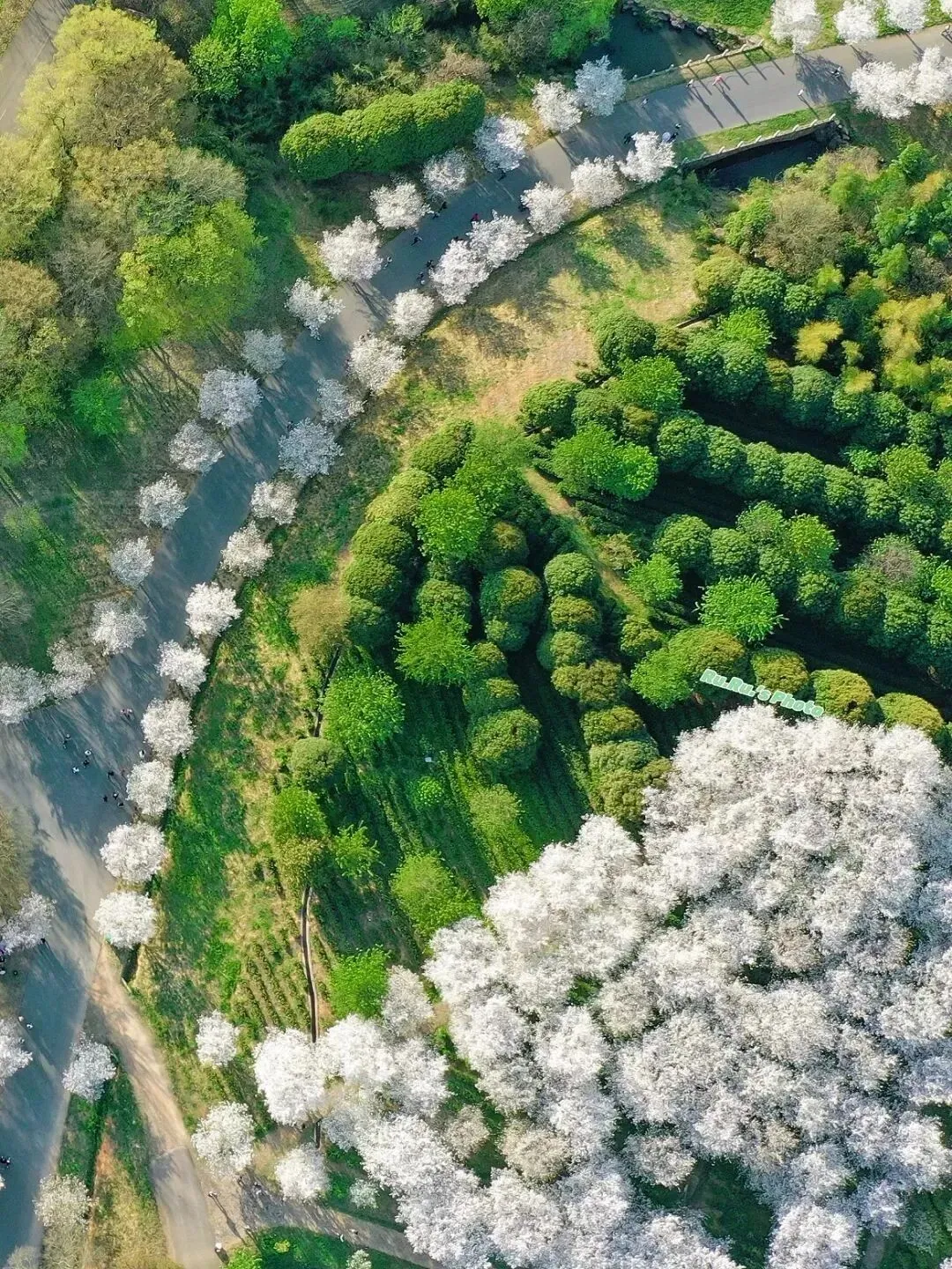 穿行在樱花大道,满眼都是大草坪、古风亭台和樱花树交织的灵动画面。