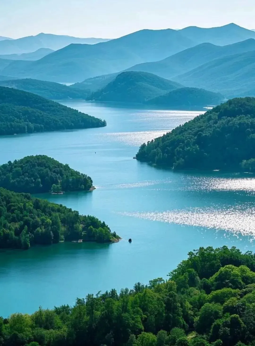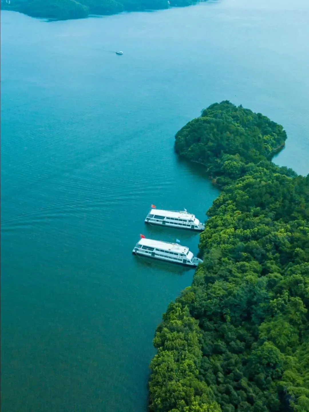除了樱花,天目湖本身也很值得细逛。四面环山,湖中小岛星罗棋布,俯瞰整个天目湖,就宛若一块遗留在人世间的玉石翡翠。