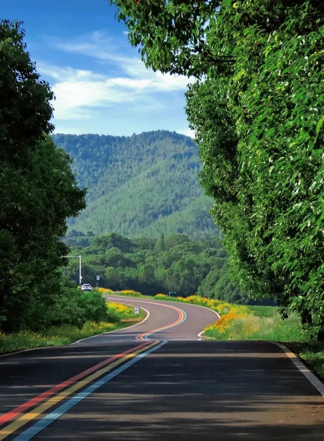 当车子行驶在这条公路上,可以看见春日的花海,漫画一般的蓝天白云,每一帧都治愈炸了。