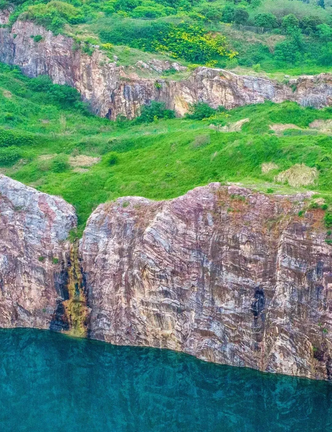 上黄有很多矿石开采后遗留下的矿坑,由于湖中沉积的矿物质,而且水质清澈,所以会让湖水呈现出如大海一般的蓝色。